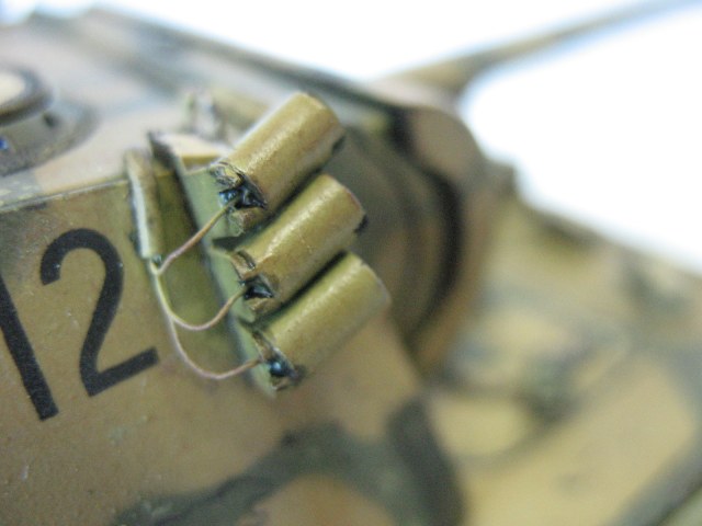 Да вроде есть у меня эта книжка. Экраны мне тоже показалось далековато получились. С этими сетками вообще у кого как. А на фотках каких только нет, старался масштаб выдержать. Ведро можно снять, в принципе, я его под мазут старался вымазать, поэтому и подтеки на нем толстые. Буду думать - раз ведро не понравилось, значит танк не заметили, прокатило))))