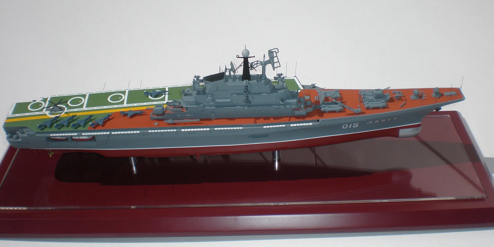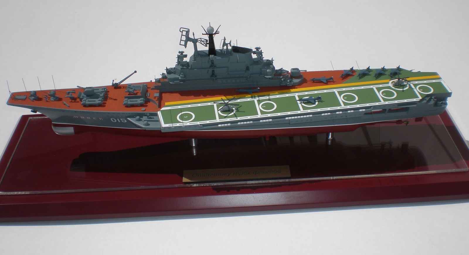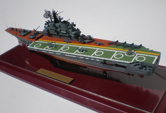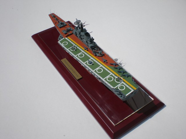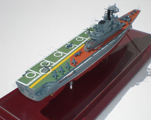 Ну вот, День ВМФ послезавтра, - а в Прихожей НИ Одного корабля! Придётся мне отдуваться:) Увы - это опять заказ, срок - 9 дней (уложился), ну а что успею исправить - то и ладно. При этом леерные ограждения не успеть установить по-любому. Что успел: антенна дальней связи паяная, стволы АК-726 рассверлены и сделаны наводящимися по вертикали; стволы АК-630 заменены на более копийные; добавлена подкильная ГАС (МГ-342?), часть антенн РЛС заменена на самодельные (тоже не шедевр, но хоть похожее, чем то, что у Трампа); самолёты изрядно перепилены и стали похожи на Як-38М. Палубу устал шкурить - вся разметка в этой модели выполнена... отлитой в пластике! Декали очень мало, а на Яки она и вовсе ...для КНР!
