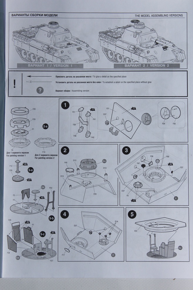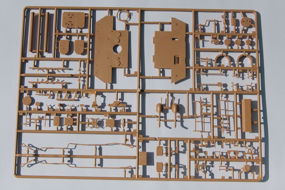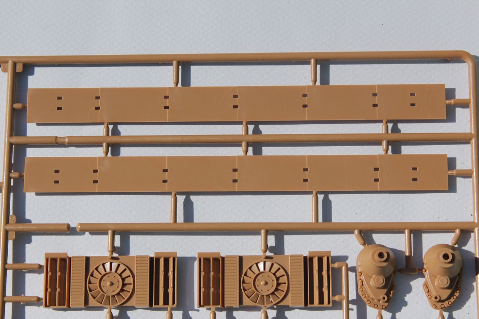Открыв коробку, мы видим 4 литника с наборными рабочими траками да да именно с рабочими! Траки сделаны по принципу AFVсостоят из двух частей и тут же первые минусы облой и недолив, ну без этого звезда не может! Дальше идёт ванна корпуса вот тут мне всё понравилось ни утяжин ни поведённого пластика нет (пока нет), дальше идёт большой литник с деталями башни. Тут Звезда решила нас порадовать и изобразила даже внутрянку башни! Но на башне я так и не увидел следов газовой резки, да и ствол опять из двух половинок ну куда это годится (менять обязательно), ещё бросился в глаза спаренный пулемёт это всё, что угодно, но не MG (менять). Следующий литник это разная мелочевка по корпусу плююсь лобовая броня и корма. Тут мне понравились проработка люков, два чурбака под домкрат на выбор, троса опять пластик (можно сразу в помойку) выхлопные патрубки которые требуют, что бы их высверлили. Ещё один большой литник с деталями корпуса тут тоже не плохо утяжин, облоя вроде всё хорошо кроме огромных углублений по планку шанцевого инструмента, зачем это сделали, я не представляю, что бы их убрать нужно будет много шпатлёвки. Зато есть аж четыре передних крыла и имитация вентиляторов, т.е. под сетками МТО не будет пустоты это хорошо, бортовые экраны опять одной толстой деталью и это плохо. Дальше идут два литника с ходовой и тут нас ждёт сюрприз это части траков это значит, наши рабочие траки не совсем рабочие ну не могут сделать всё нормально (и вот тут я оказался не прав, сборка траков показала, что набрных траков как раз на две ленты да ещё с нормальным запасом). На резиновых бандажах катков слабо просматривается маркировка производителя Dunlop, думаю после покраски, видно её не будет, ещё есть крепления под бортовые экраны, если их чуть подточить, то даже и не плохие. Последний литник это литник с прозрачными деталями остекления, декаль в наборе довольно паршивая, всё какое-то кривое, в общем использовать её не рекомендуется. Инструкция выполнена в виде книжки на четырёх страница под два варианта унылых декалей два варианта покраски всё под 43й год.
