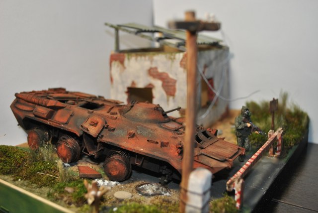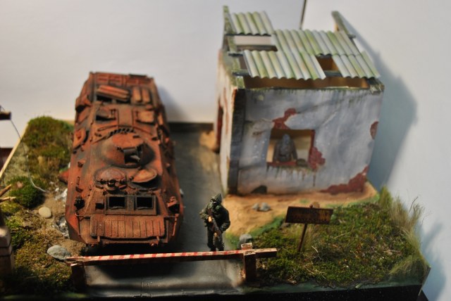 Строительство данной диорамы началось с неудачной покраски БТР,и ничего более как его заржавить, причем сильно не осталось.По задумке,сюжет выдуман так.КПП в зону ,подчистую выгоревшый БТР и соответственно заржавевший под радиоактивными дождями Будка кпп в которой можно укрыться от выброса. Красилось все эмалью тамиа ,пигменты мастер-пигмент,растительность мох и лен, будка из гипса.Сталкер смола.