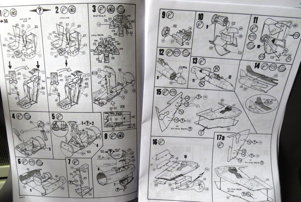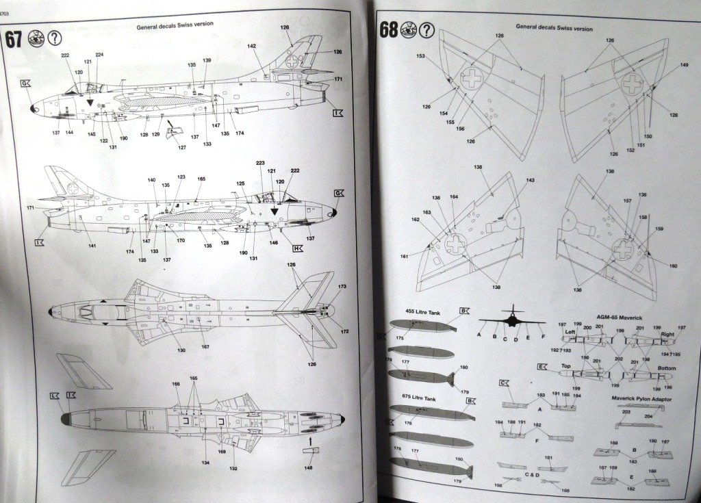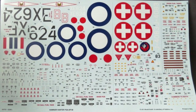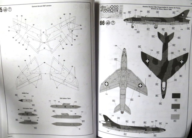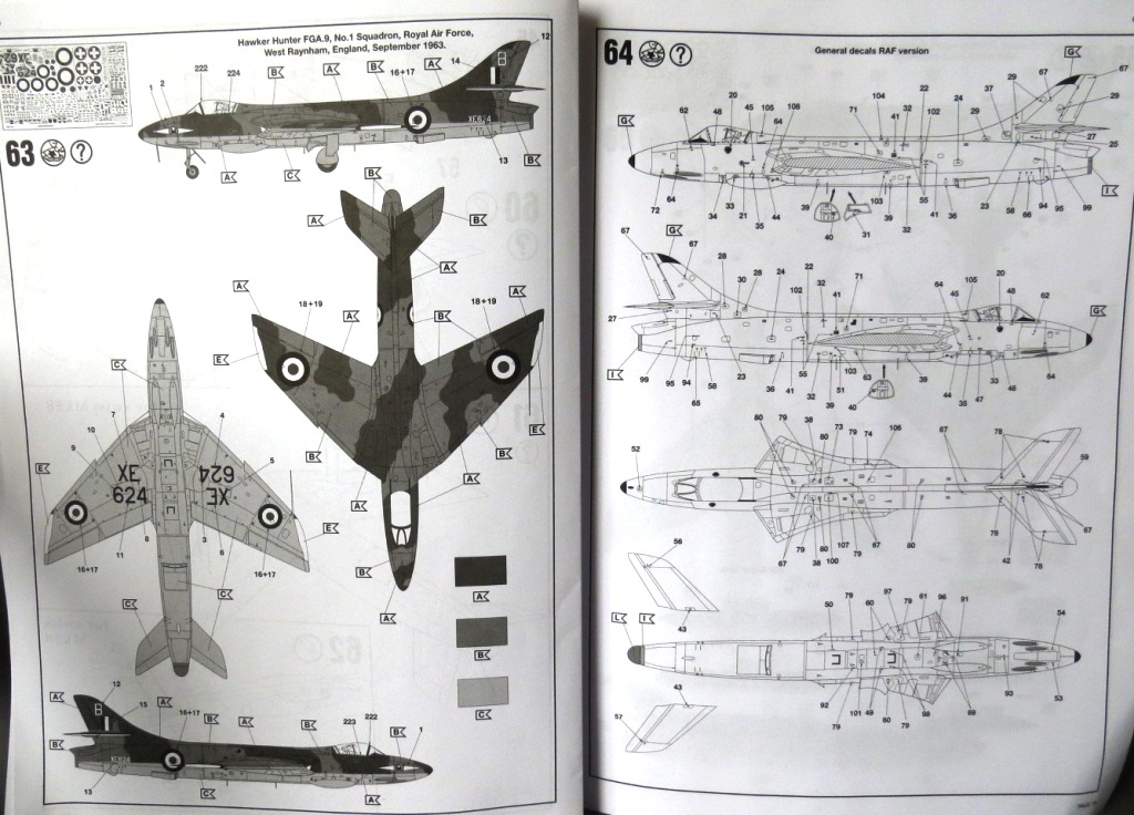 Окраска на два варианта,FGA.9(1-й эскадрильи, Royal Air Force, Западная Raynham, Англия, сентябрь 1963) и Mk.58( Fliegerstaffel 21, ВВС Швейцарии, Эммен авиабаза, март 1994),декали хорошего качества,много времени уйдет на техничку-ее там немеренно.