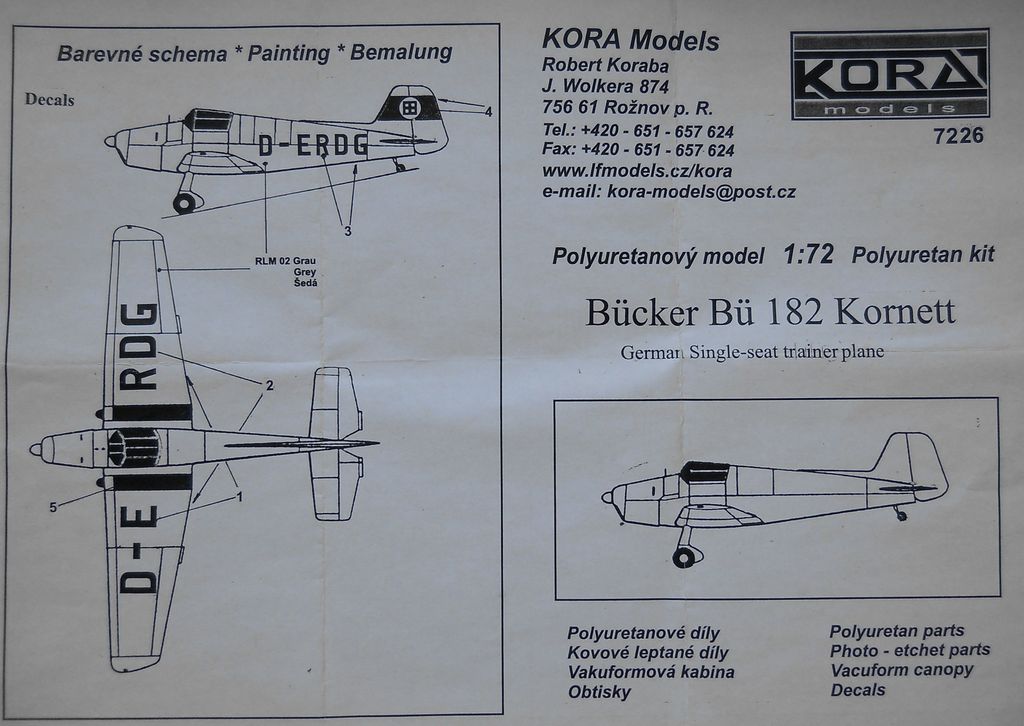 Модель из смолы от фирмы Kora Models в масштабе 1/72 (номер по каталогу 7226) упакована в картонную коробку (12х11х3см) с верхним открытием. Неплохое литьё, аккуратная расшивка, спартанская деталировка. Ваку-фонарь нормального качества. Присутствует небольшая плата фототравления. Декали выглядят весьма хорошо. Приборная доска напечатана на бумаге не очень качественно. Инструкция вполне наглядна и информативна.