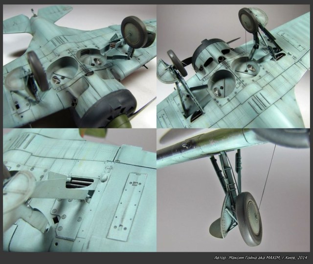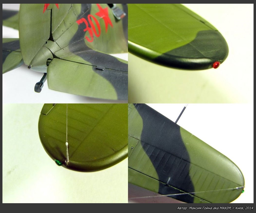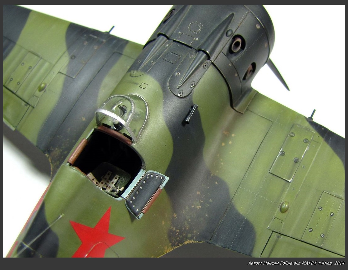 О сборке, доработках и покраске. Набор хорошей деталировки и стыкуемости с имеющимся набором цветного травления для кабины и масками - это из приятного. Но есть и неточности. Так была выправлена геометрия киля и гаргрота, снесены все кромки оперения, добавлены крепежи нити антенны, добавлены механизмы приводов рулей и отверстия в обтекателе для них, переделаны задний и крыльевые АНО, переделаны патрубки (тянутый литник), рули высоты отделены от стабилизаторов и имитирована их приспущеность, имитирована щель нахлеста обтекателя капота, вырезаны все необходимые смотровые окошки в нишах шасси, имитированы тяги внутри крыльев механизма выпуска шасси, снесены толщины всех щитков шасси, имитированы крепления щитков шасси и магистрали гидравлики, добавлены тримера на элероны и предохранительные крышки петель на рулях высоты (листовая дюраль), кабинет доработан тягами от рычагов и снесены толщины бронеспинки и кресла, педеделано стекло приыела, добавлены отверстия для подсветки приборной панели и отверстия для поручней посадки пилота, имитированы накладушки дверц кабины, снесена толщина козырька (стекло) кабины, добавлена линия расшивки кока винта, высверлены и исправлены все отверстия в лобовой части обтекателя капота, вырезаны отверстия звенья и гильза выбрасывателей, имитирован клеп. Покраска производилась акриловыми красками Ганзе и Тамии.