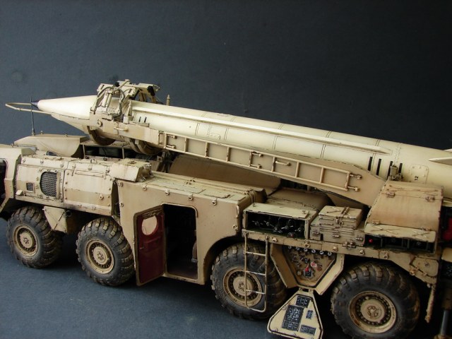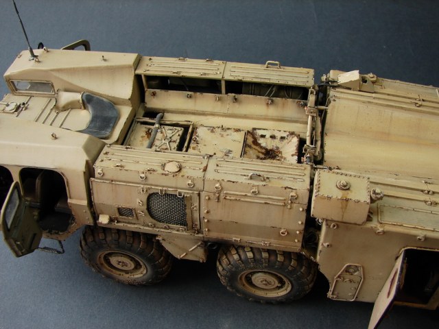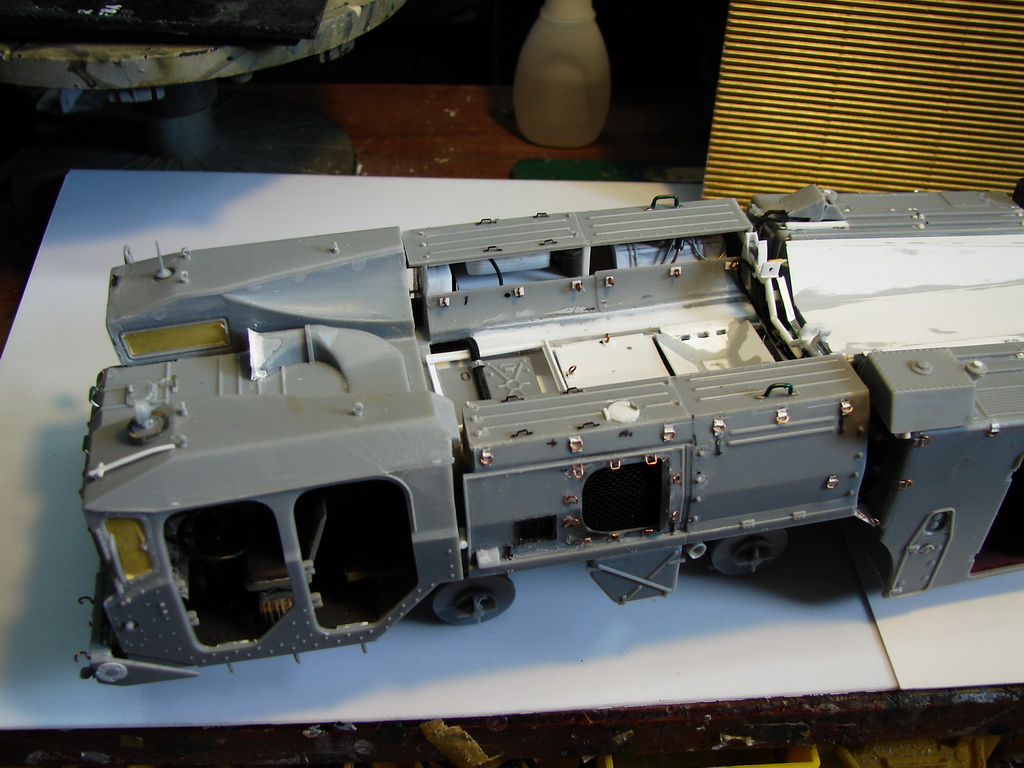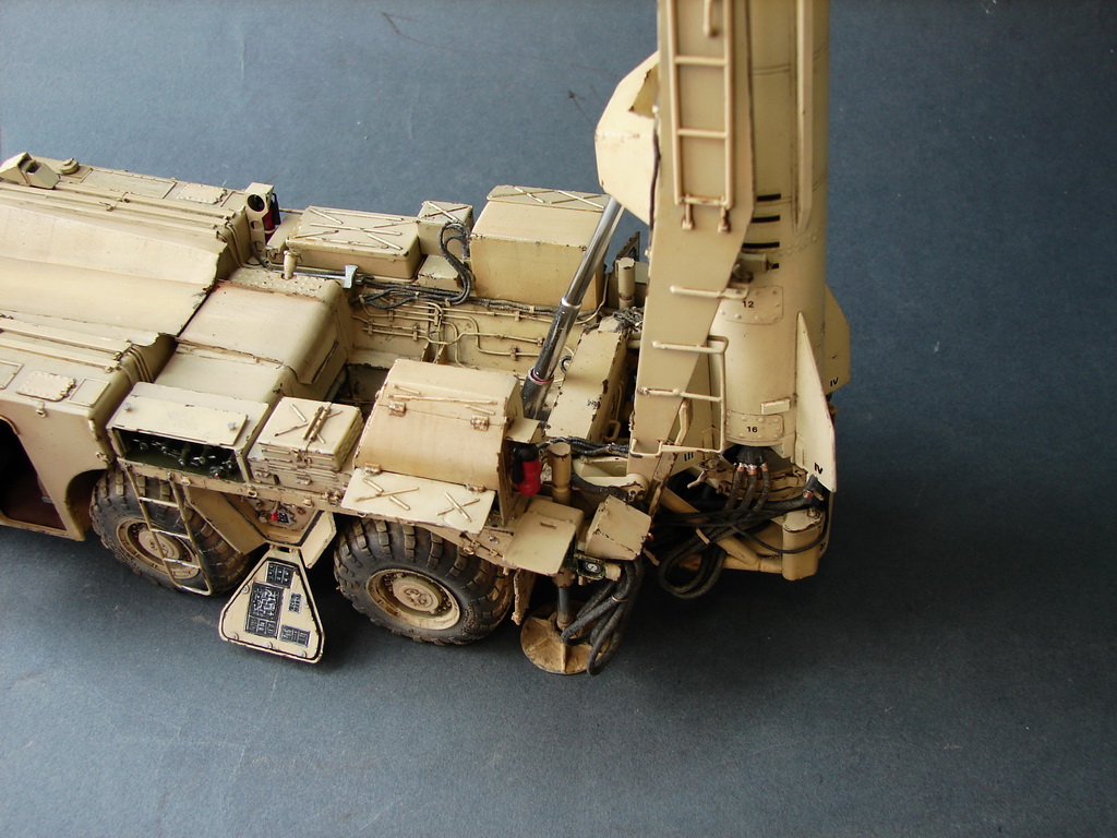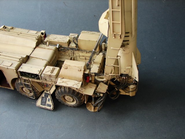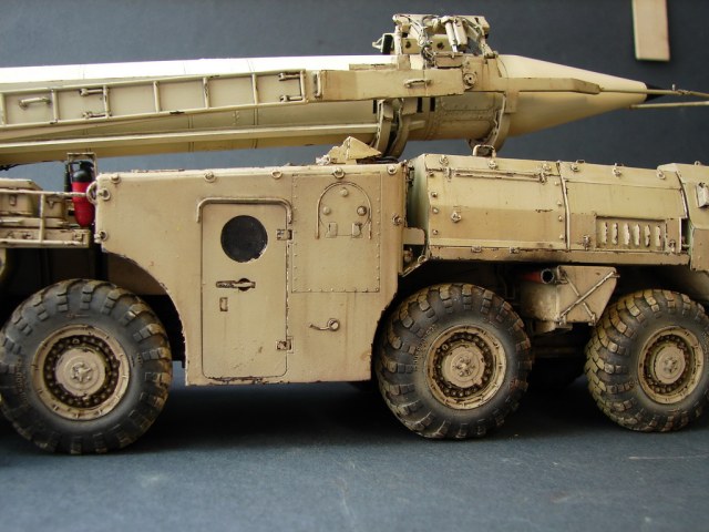 Даже не помню где и когда эту модель купил.Но лет 18, она пролежала у меня точно.))Коробка пережила даже затопление ,от лопнувшей лет 10 назад батареи отопления.В течении этих лет было куплено травление от Эдика.Правда,набор экстерьера старой каденции и не имеет третьей платы где даны различные петельки и др необходимые вещи.Ну,и самое главное -колеса.Спасибо товарищу ,который мне их подогнал .Вначале не планировал делать видимым интерьер,но со временем пришел аппетит.Даже когда начинал делать кабину,то особо не заморачивался и сделал неправильные основания под сиденья.( Давно запланировал диораму с ним.Брошенный в пустыне и найденный спец группой на Хамви,которые и были созданы для поиска и уничтожения Скадов.Пришлось делать все возможные лючки и двери открытыми.Много читал про эту модель ,а оказалось,что не все так страшно.Правда,40% придется воспроизвести самому).Многие вещи очень утрированы.Много времени уходило на просмотр фото прототипа.Каждую мелочь приходилось сверять с фото.Оговорюсь сразу-делал то,что видно и не гонялся за точным размерами.Заковыристая работа получилась.)На сегодняшний день-самая сложная,для меня,работа.Даже водомет,хотя он и делался "с нуля",был легче.