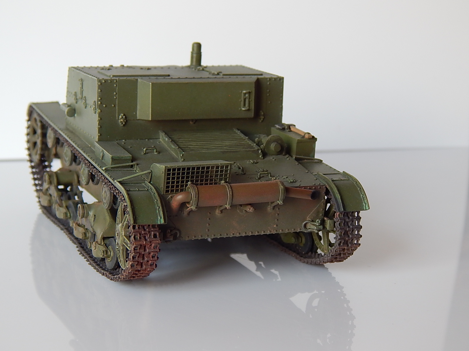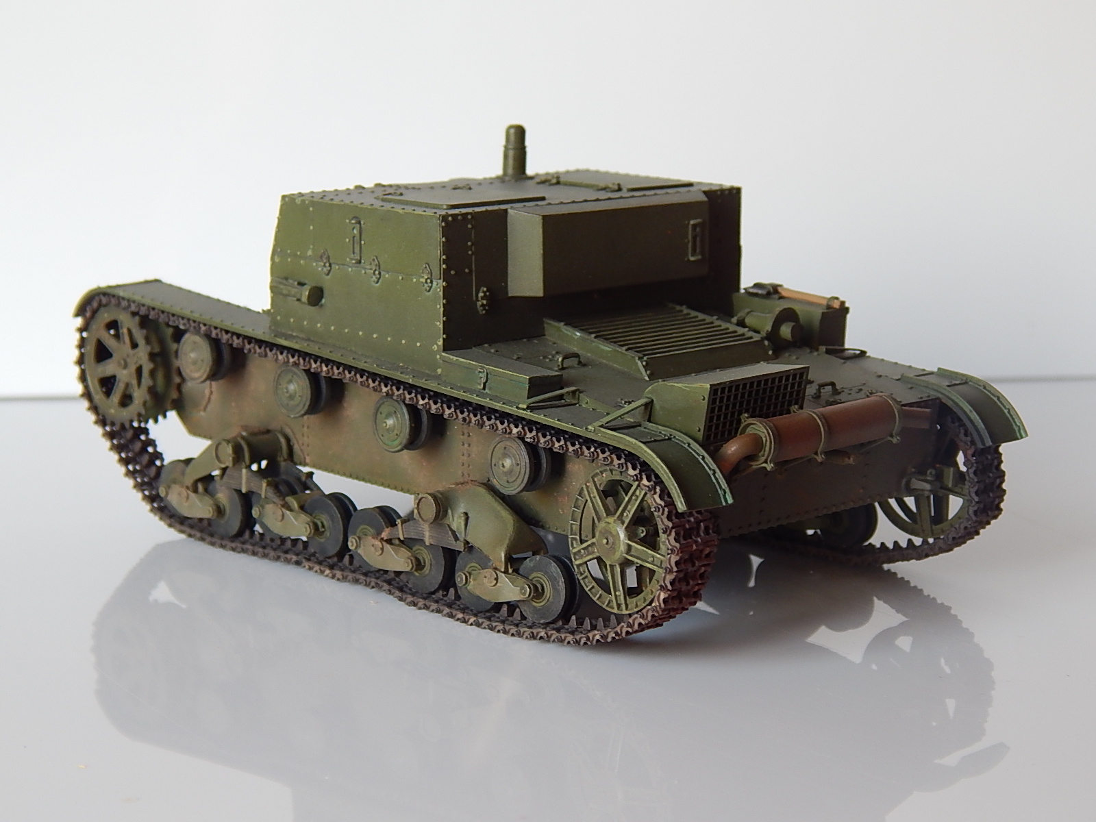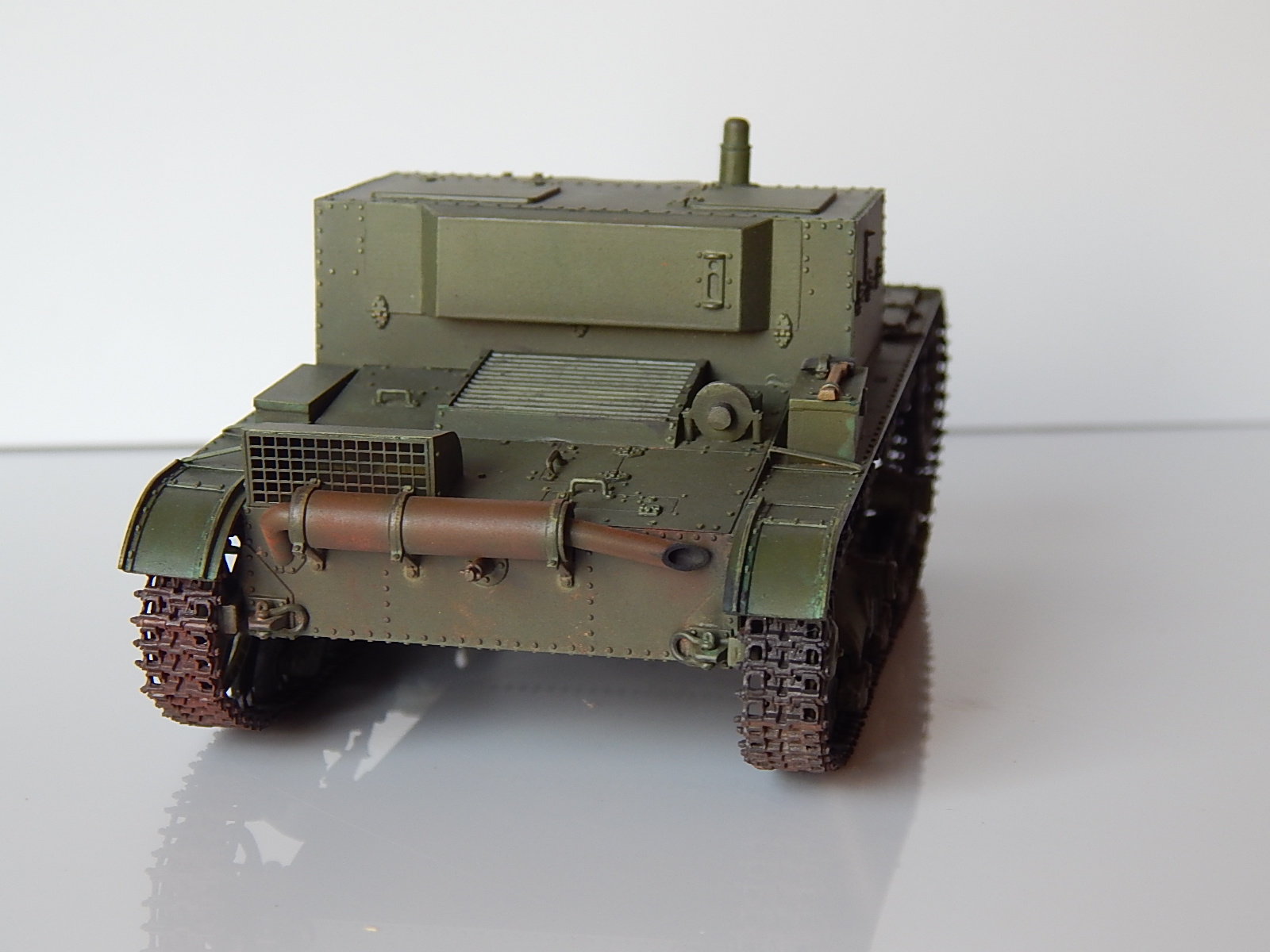 Hobby Boss - настоящее название фирмы. К тому же на ведущих звёздочках отсутствуют ступицы. По выступающим частям траком можно пройтись чем-нибудь металлического цвета. А так в целом ничего, нормально.