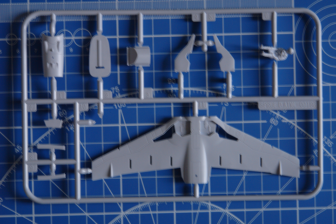 Модель упакована в яркую, глянцевую полиграфию, средней жесткости, даже скорее мягкой, с верхней загрузкой размером 24х12х5см. Открывая коробку, находим там пять литников. Четыре серого литья и один прозрачный. Облоя нет, качество расшивки, как по мне, так вообще идеал. Вроде даже есть намеки на интерьер ниш шасси. Стекло тонкое, прозрачность чудесная. Стыкуемость всего этого, покажет процесс сборки.