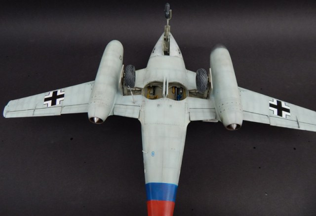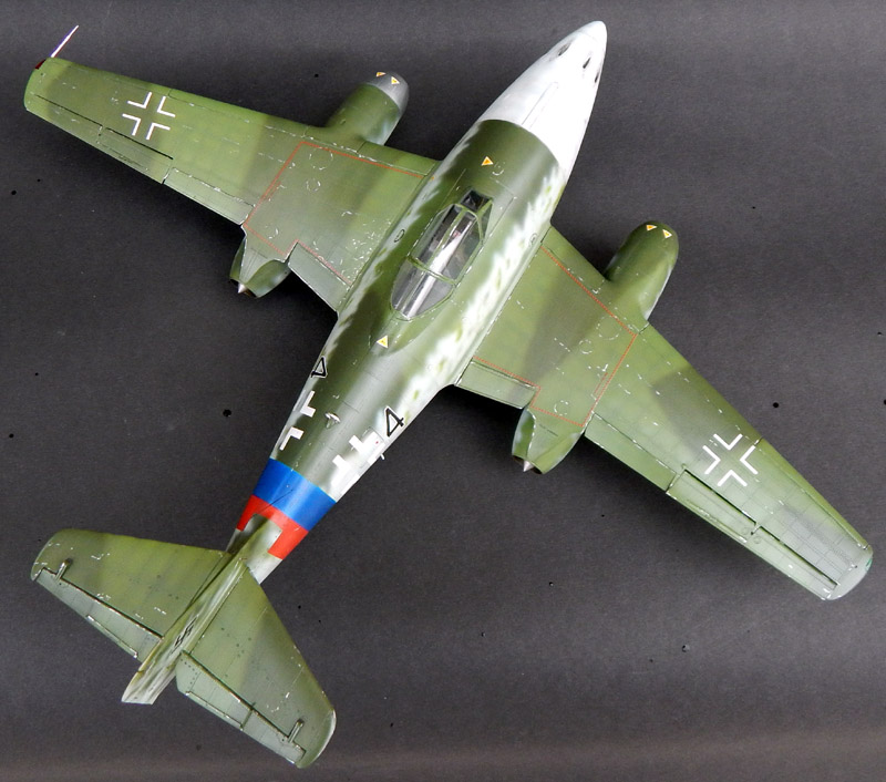 Окрасил модель красками Gunze – RLM 82/83 и Акан RLM 76 - нижние поверхности и светло-серый – окраска носа. Металлические части окрашены супер-металликами от «Ганзы». Потом покрыл футурой и нанес декали. Полосы «защиты Рейха» и номер «4» накрашены при помощи масок. После нанесения декалей и маркировки, нанес еще один слой футуры и выделил расшивку и клепку при помощи темно-коричневой смывки от Тамии. Нанес финальный слой полуматового акрилового лака от Vallejo.