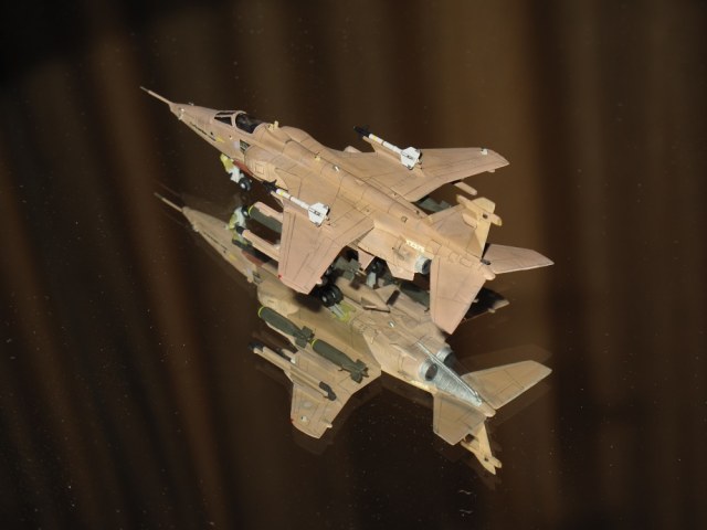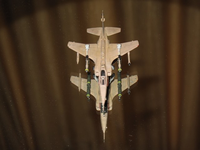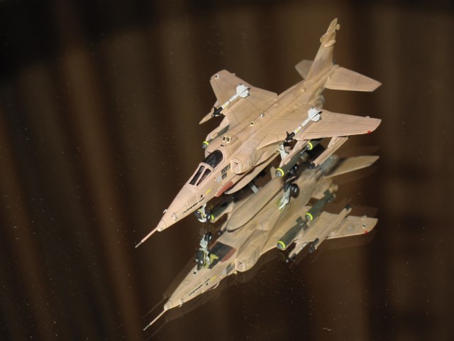 Набор Academy – это единственная модель самолёта SEPECAT Jaguar в масштабе 1/144. По крайней мере, единственная из доступных, других не встречал. Некоторое время, модель выпускала фирма Revell, но это был тот же самый набор. По большому счёту, моделью-то это назвать можно с натяжкой, скорее сборная игрушка. Поэтому, работы тут было очень много. Практически, всё подвесное вооружение сделано вручную. Только ракеты Sidewinder взял из другого набора и доработал. Красил кистью, краской Humbrol. Недавно модель отреставрировал - покрыл матовым лаком из аэрографа и еще кое-что по мелочи. Самое слабое место здесь, на мой взгляд, это фонарь - сейчас бы сделал его намного лучше. Но это уж пусть остаётся как есть.