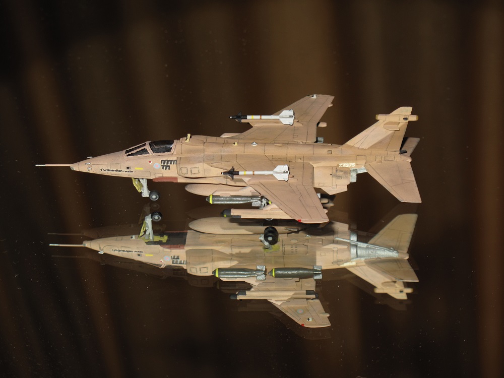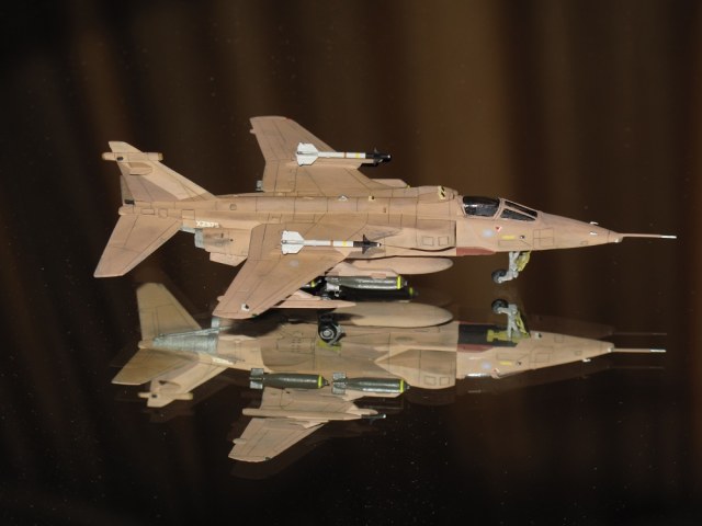 Рассказывать про операцию «Буря в пустыне» и участие в ней истребителей-бомбардировщиков Jaguar ВВС Великобритании, я думаю, смысла нет. Поэтому, сразу расскажу про модель. Она делалась около 15-ти лет назад. Первая, которую я делал всерьёз. Искал в интернете информацию и фотографии по прототипу, доделывал и переделывал все несоответствия. То еще занятие было тогда - интернет через Dial-up модем, скорость низкая, связь постоянно рвётся. В общем, кто помнит то время, тот поймёт. Но процесс этот, тем не менее, оказался интересным и затягивающим.