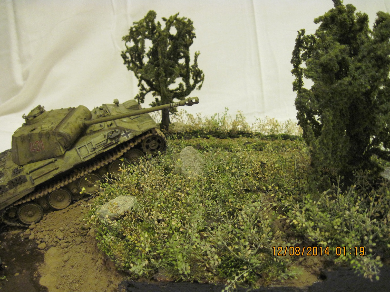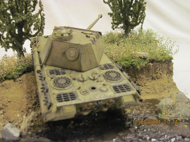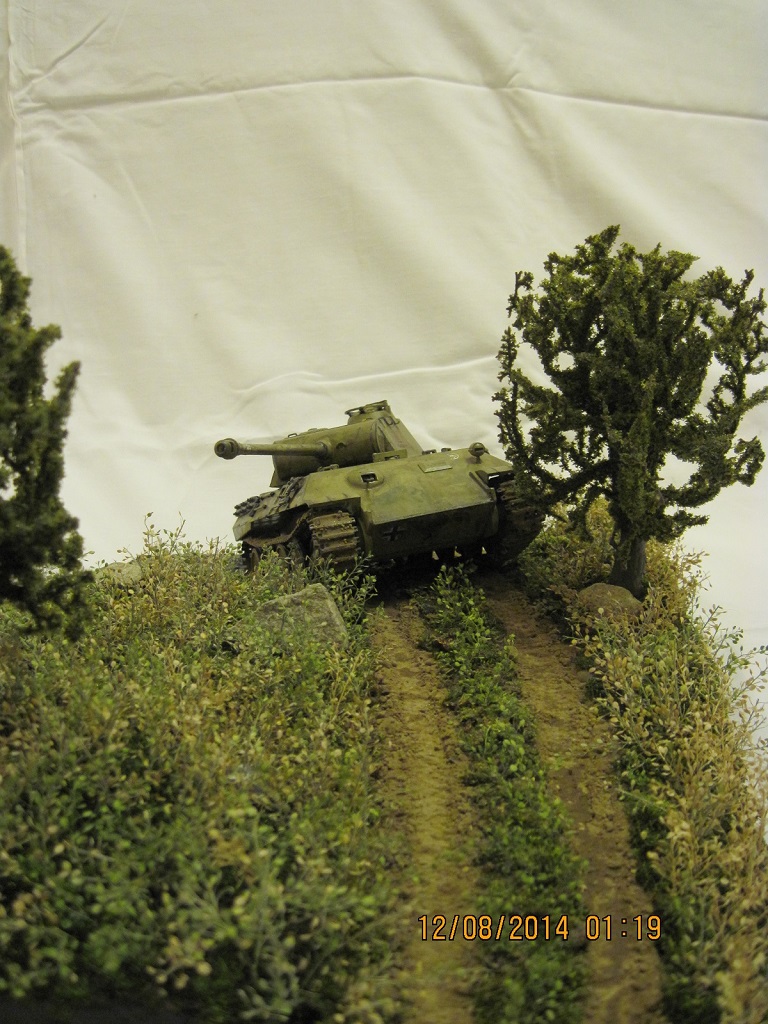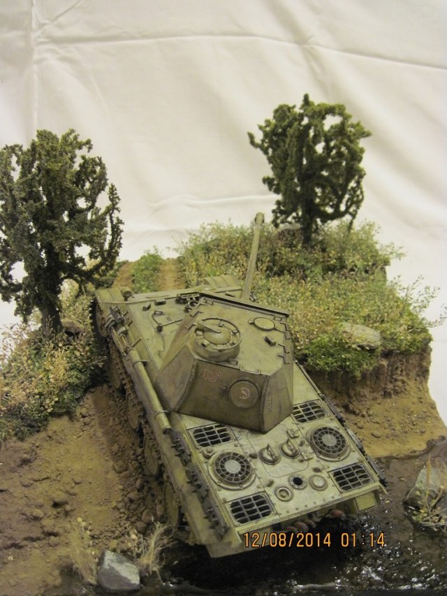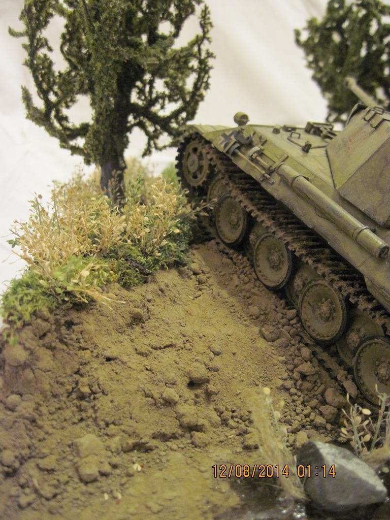 На диораму была поставлена модель танка pz.kpfw V "Пантера" производителя tamiya models. использовалась смывка и краски акрил, того же производителя. основа диорамы сделана из трех слоев брикета пенопласта , покрыта шпатлевкой по дереву и покрашена в черный цвет. позже были нанесены три грунта и насажена трава. трава сделана из мха и сушеных трав... деревья были высажены готовые, дабы я не обучился в данной области))) вода эмитирована канцелярским клеем и краской тамия... над реалистичностью обрывов покорпел)) заранее благодарен за внимание.