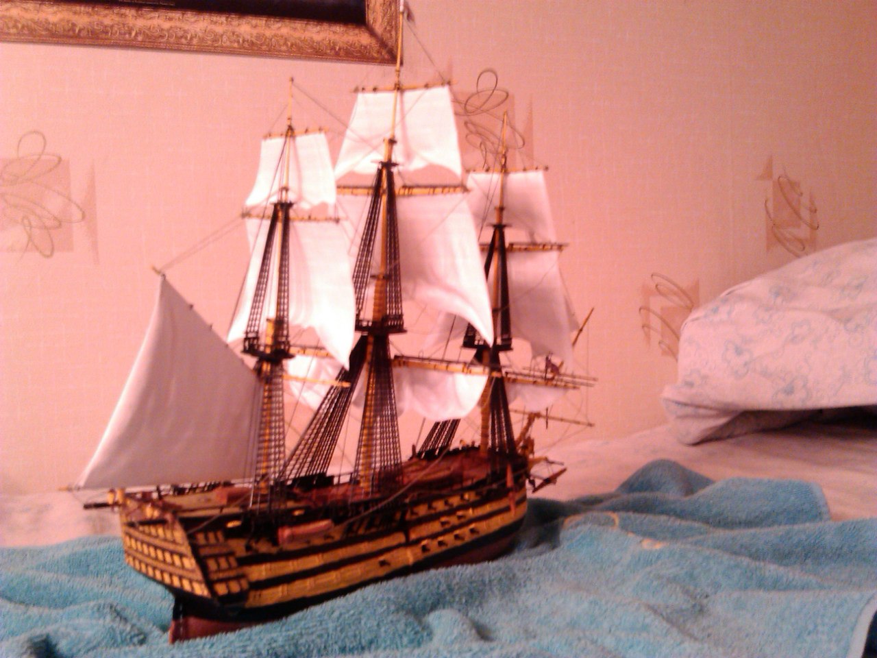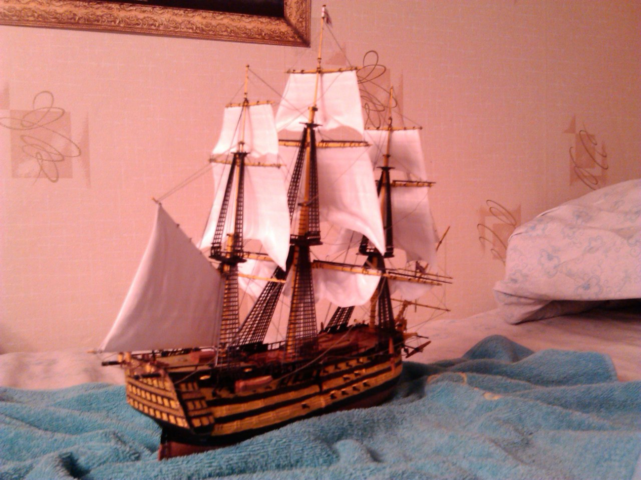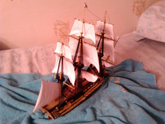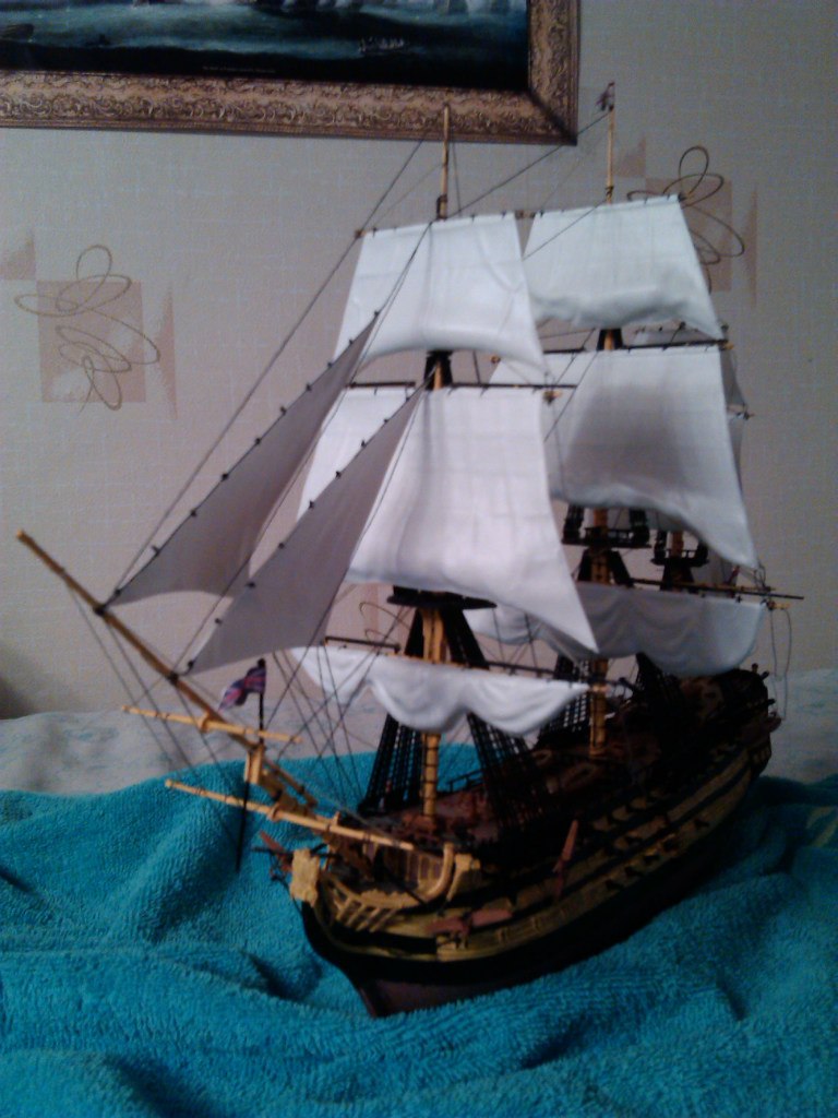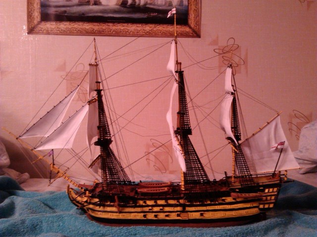 Корабль адмирала Нельсона "Виктори" в битве при Трафальгаре. Корабль мне этот подарили, собирал я его с удовольствием, такая огневая мощь!. При изготовке этого корабля понимаешь, какой урон мог он нанести другим кораблям, какое огромное у него водоизмещение, как тяжело было им управлять.