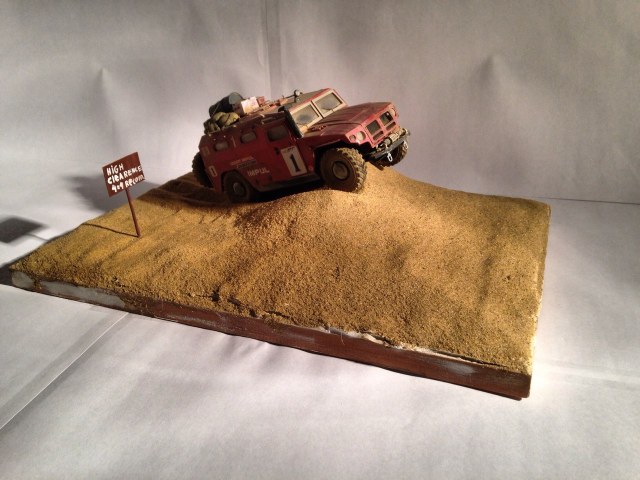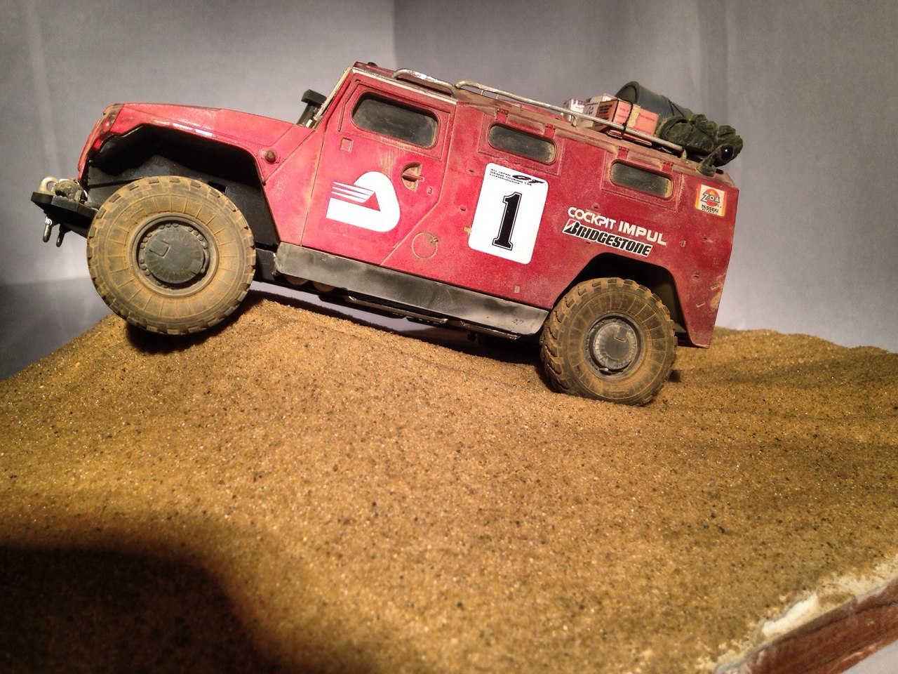 Оригинальная идея ,барханы ,песок...все класно. Багажник на крыше красота ...все круто очень. Единственно что я бы добавил это декали.их мало.......и песок в воздухе..чтоб была динамика....за идею пять с плюсом. Я сам мечтаю тигр зделать но немогу найти в продаже