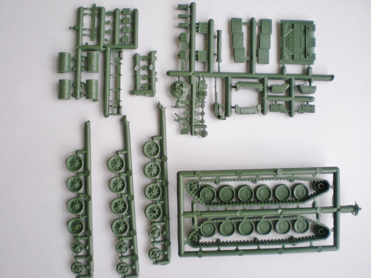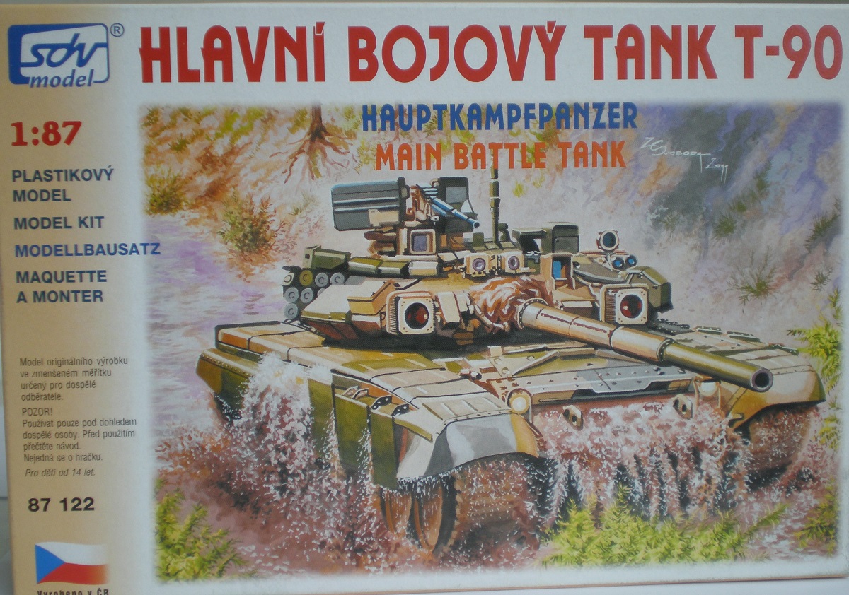 Оказывается, и чехи выпускают модель Т-90 - правда, ну Очень маленькую - в железнодорожном 87-ом. Если не напрягаться по поводу простецкой гусеницы, отлитой зацело с катками внутреннего ряда, модель очень хороша и копийна; придётся помучиться с рядом деталей, в разы переразмеренных по толщине, и трудно сделать круглым ствол, имеющим в сечении форму, близкую к перекошенному геоиду. Зато все следы толкателей на внутренних поверхностях; но... не всегда ясно, где кончается деталь и начинается облой. Нет троса и бревна. Зато пулемёт состоит аж из 5 деталей. Литьё и проработка мелких деталей порадовали. Модель достойна хорошей доработки, и результат не может не порадовать.