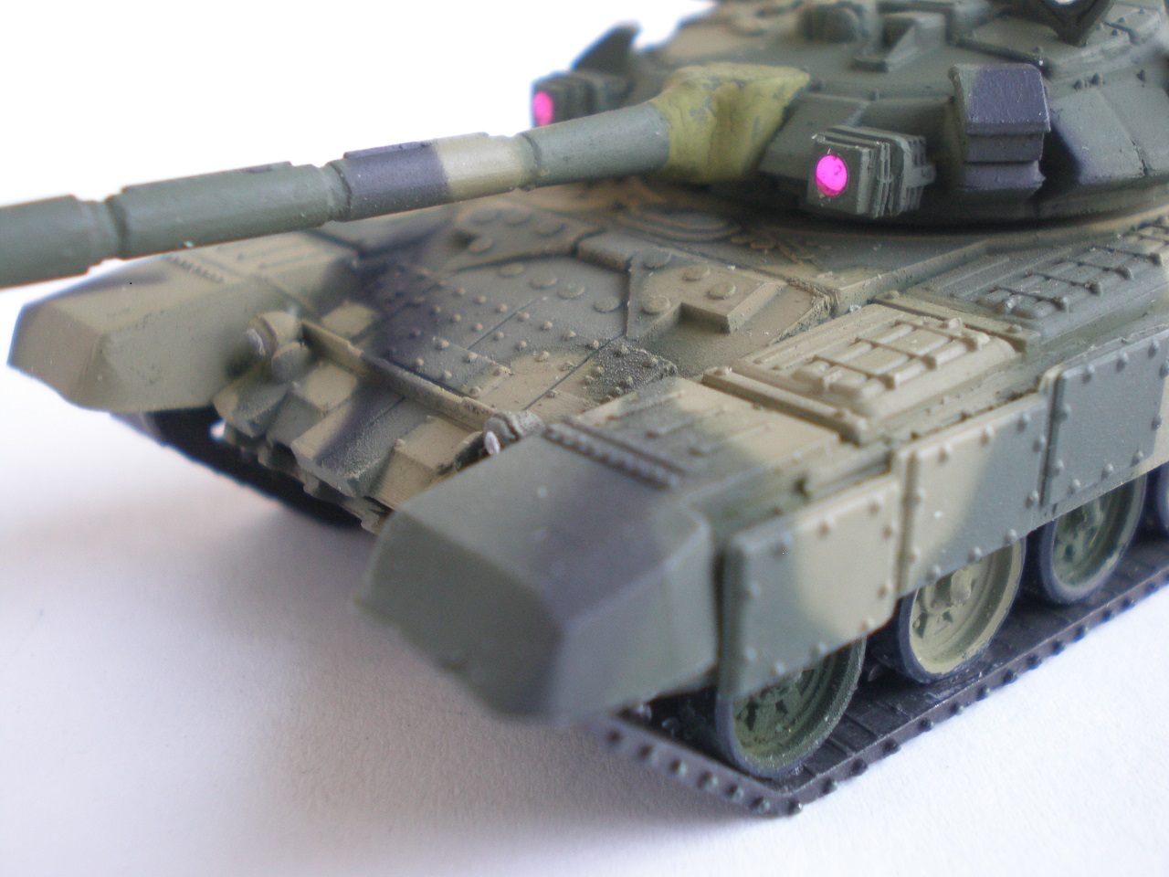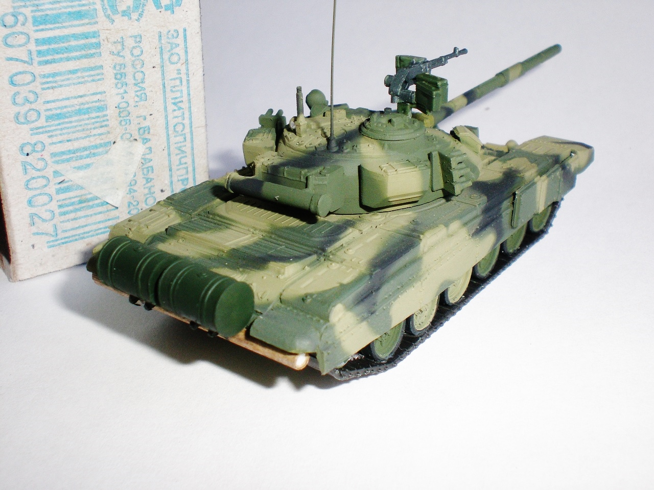 При всей аккуратной покраске что-то издалека напоминающее Т-90, на крупных планах ощущение, что бортовые экраны, судя по фактуре, из дерева выполнены. Как дополнение к ж/д диораме сойдет, а как самостоятельная единица только на Песок тянет.