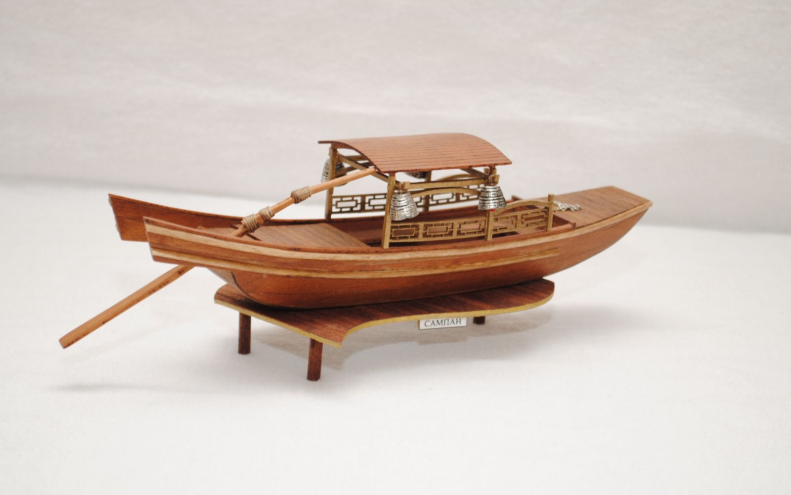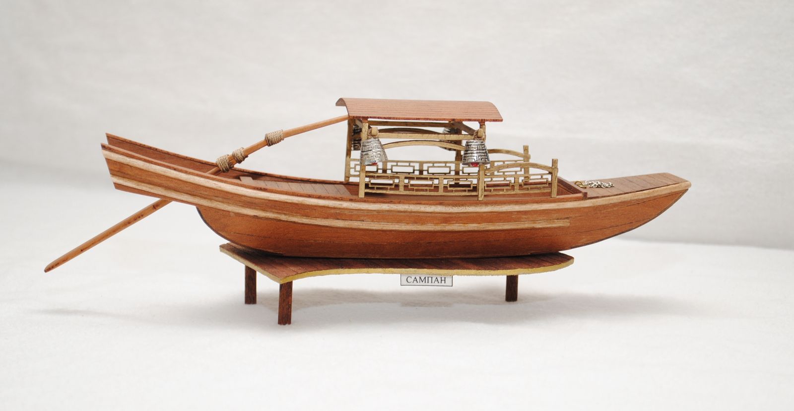 Матчасть. Такие фонари не применяются на сампанах. Такой формы и окраски. Цепь, которая в носовой части сампана, как минимум, должна не быть блестящей, во вторых, покажите фото, где Вы такую цепь видели у подобных сампанов? Дальше. Блестящие нитки использованы для сочленения румпель весла... Интересно, покрутив этот румпель, насколько они будут блестящими? И как Вы думаете, в действующем сампане, они будут в таком порядке, как у Вас.