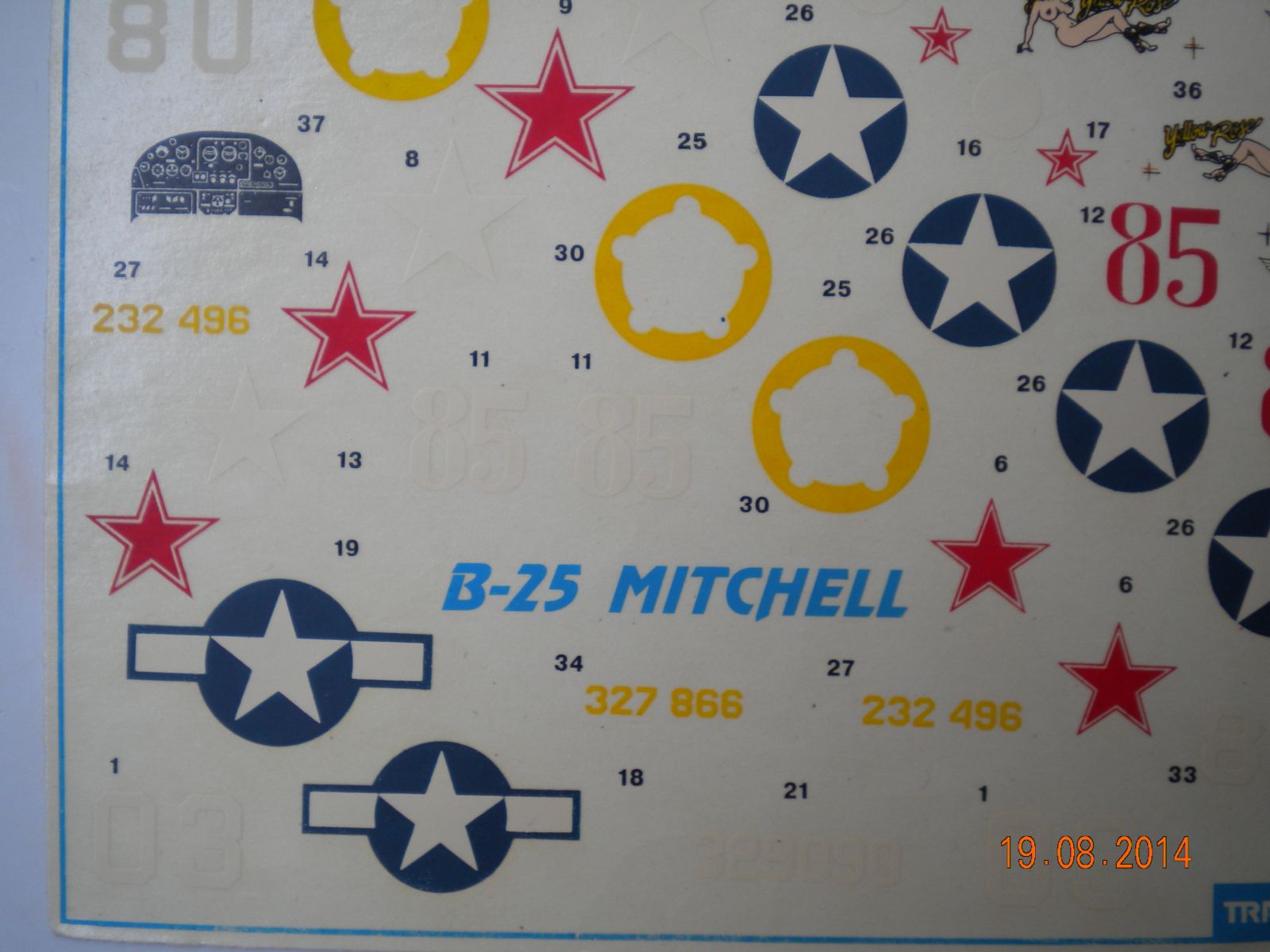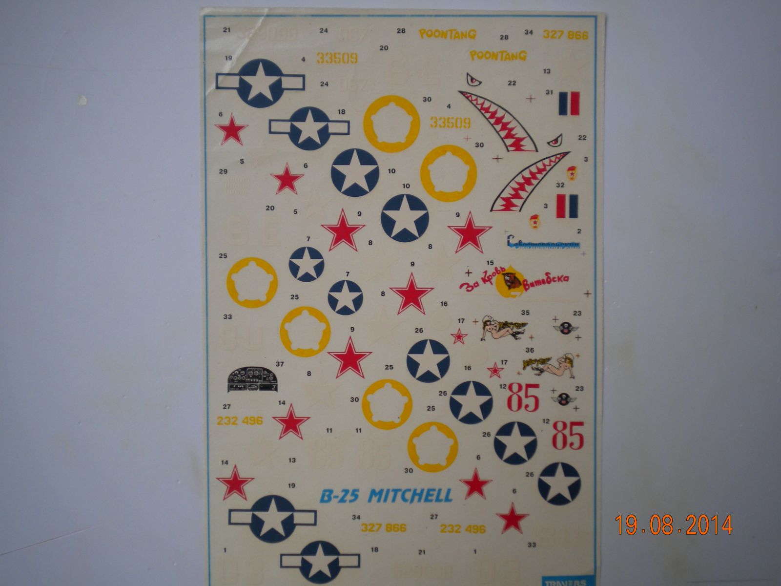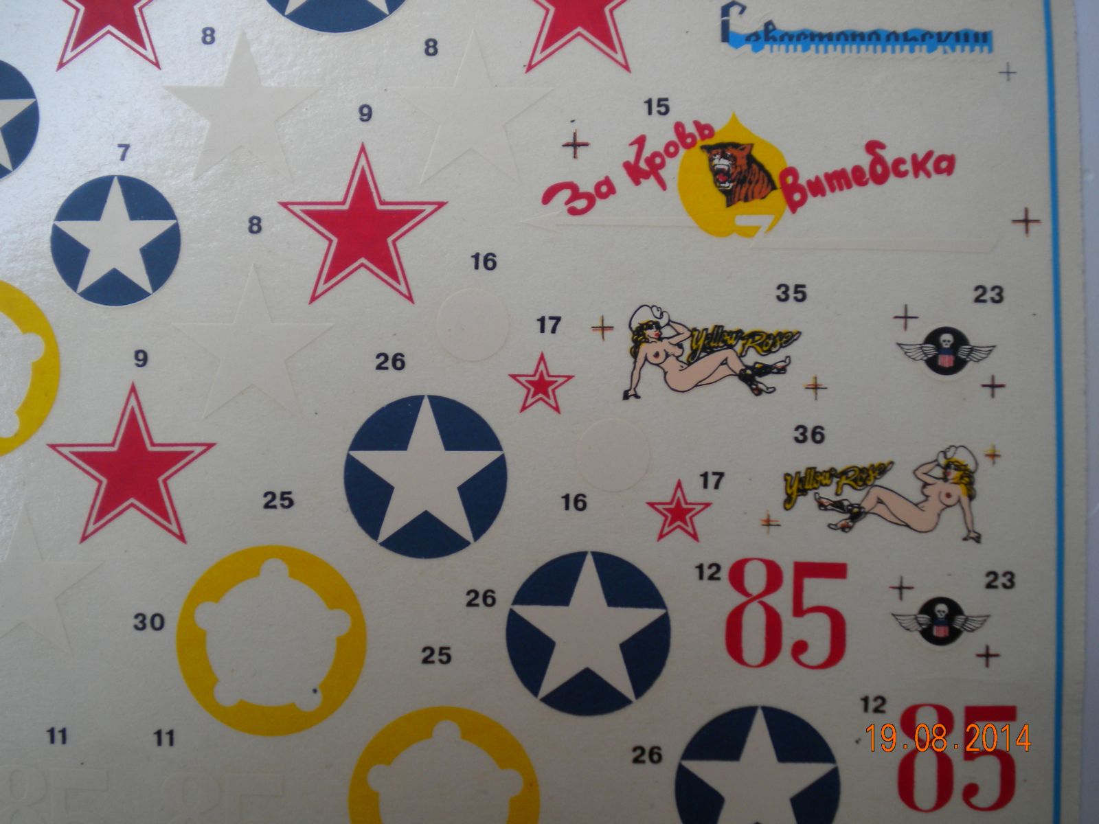 Декаль не плохая,мне она очень понравилась,смещение есть но не критичные,прорисовка нос арта приличная.Нет технички,зато есть панель приборов.Варианты даються с разных военных театров действий,в основном Советские.