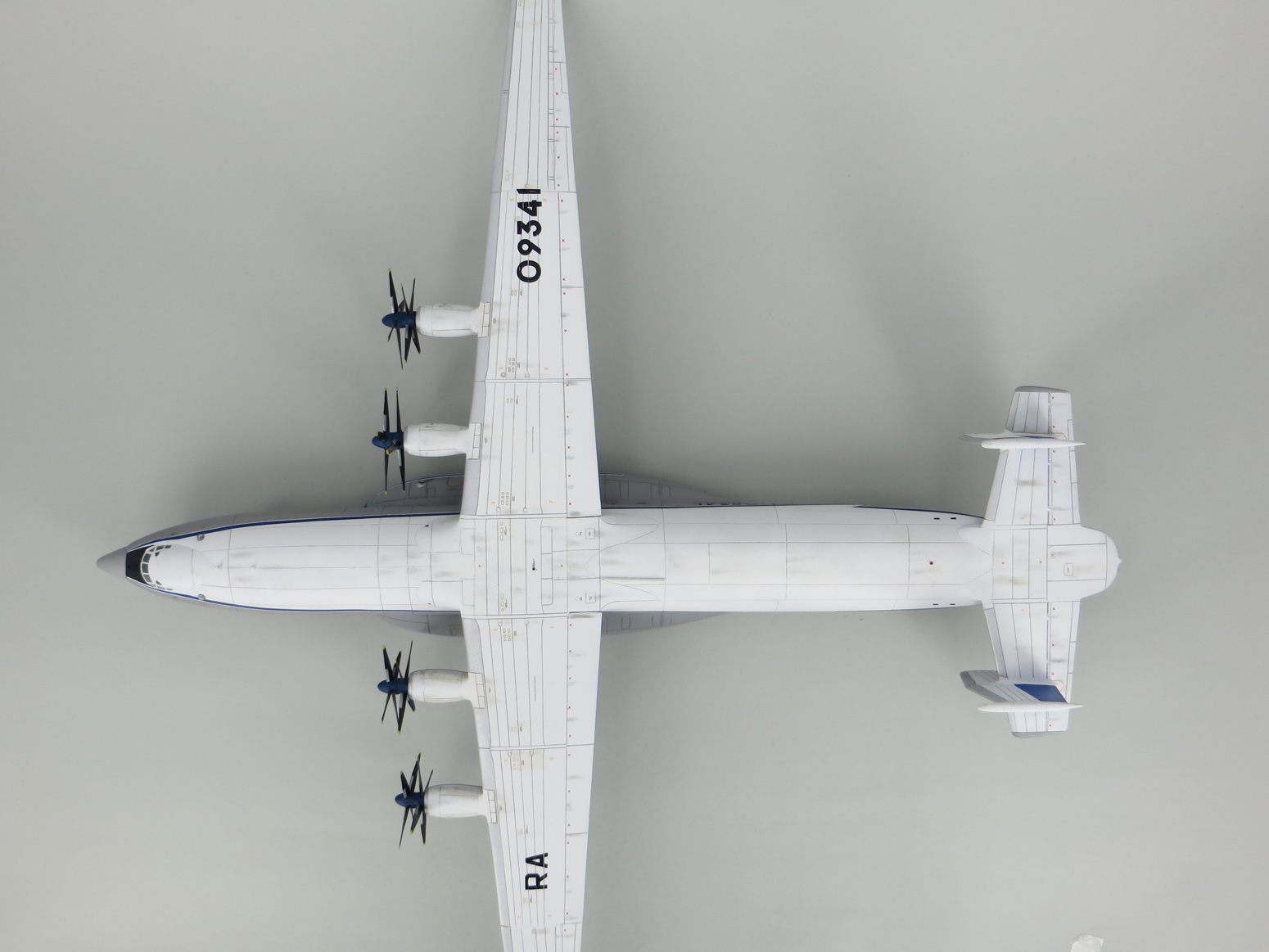 Вот такой получился Антей. В целом модель зрелищная, но немного испортило впечатление качество изготовления. Фотографировал на сером фоне, что бы не пропадал белый фюзеляж и крылья. Жду ваших оценок.
