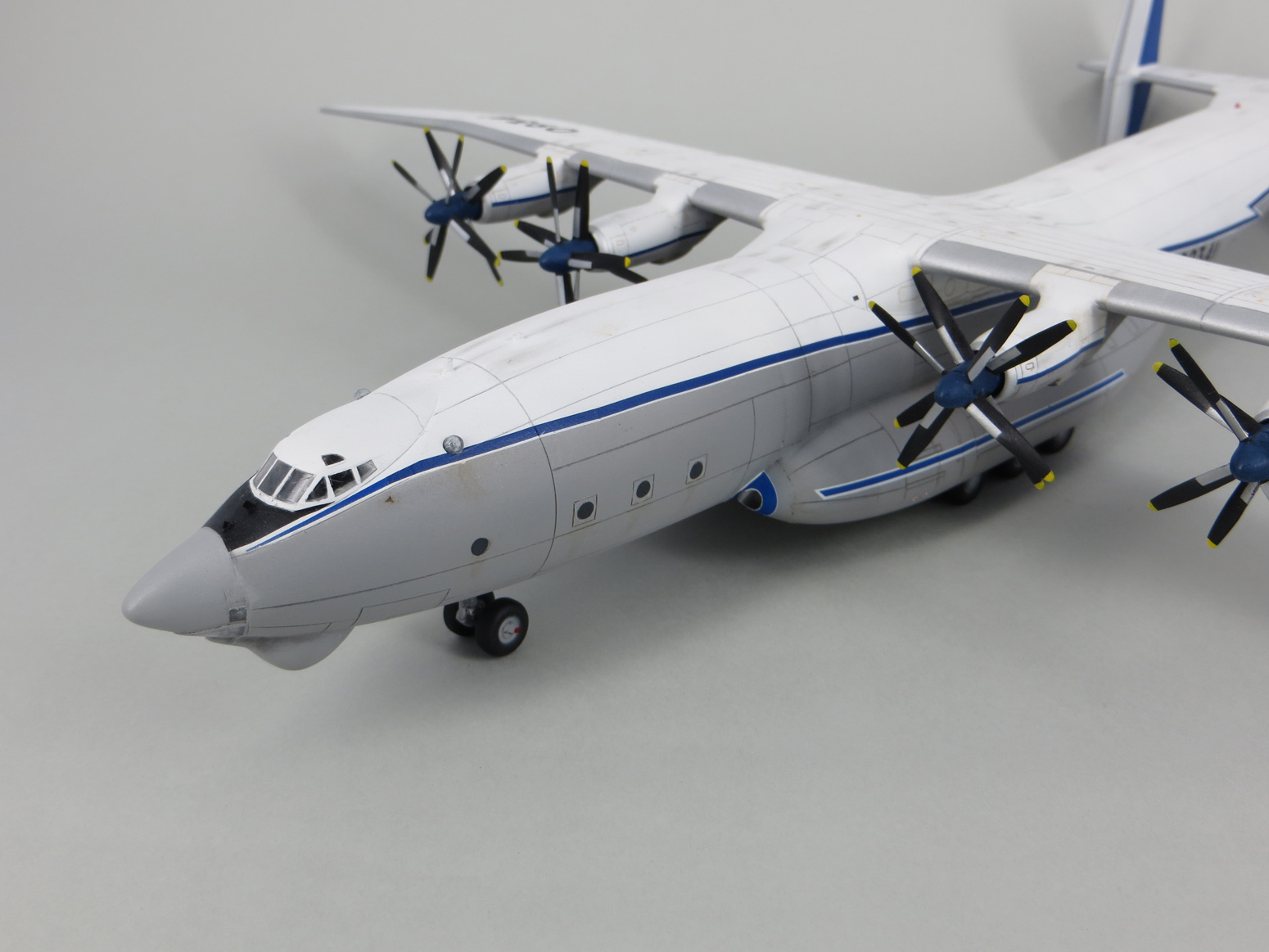 Просто запомните на будущее, что первый винтн от вала по-часовой, а ближний к вам - против. Я бы подтонировал гондолы шасси (но я вообще любитель засрать всё, так что не считается)))))) Носовой обтекатель немного подправить, да с остеклением штурмана разобраться.