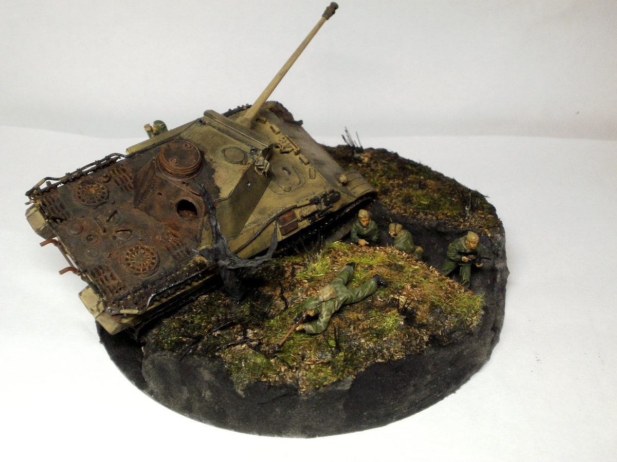 С телефона, но разобрать кое-что можно - со стороны лобовой части Пантерка смотрится приятно (соединение верхней и нижней лобовых плит "в шип" , которое упустила Звезда, обозначено, или замаскировано грязью? - не видно), сгоревшая часть ИМХО менее удачна - слишком однотонна, не хватает матовости, и граница резковата. Сначала подумал, что это проблема окраски кистью, но передумал) - пастелью можно делать весьма плавные переходы. И цвет катков смущает- он не тот, что на остальных частях машины. Или это грязь?
