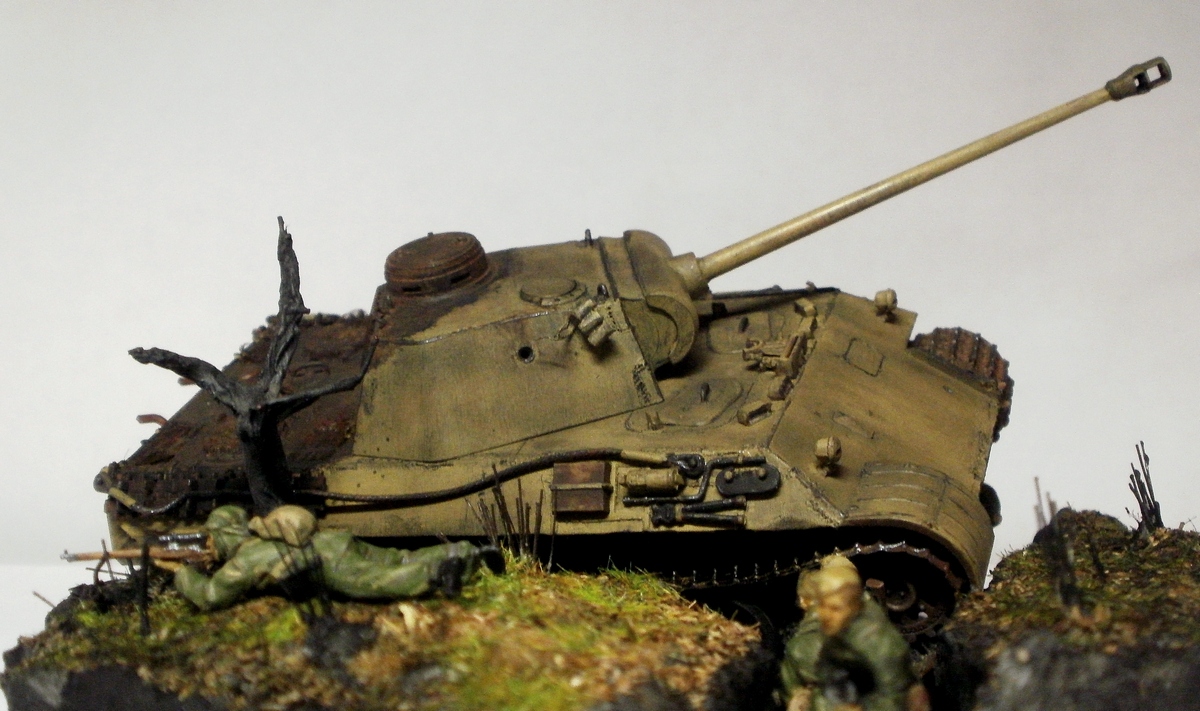 отряд разведчиков обнаружил пантеру, застрявшую в траншее одной из линий обороны(по какой пичине застряла-история умалчивает-то ли подвел двигатель и трансмиссия а потом был пожар и попадание то ли как иначе) осматривается и занимает позицию для обороны