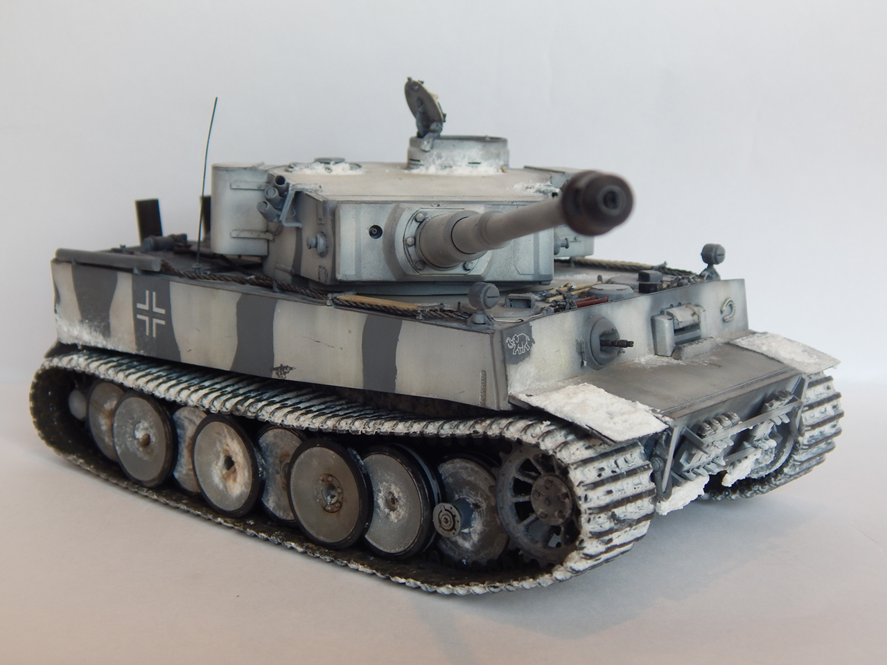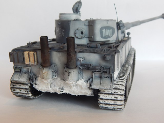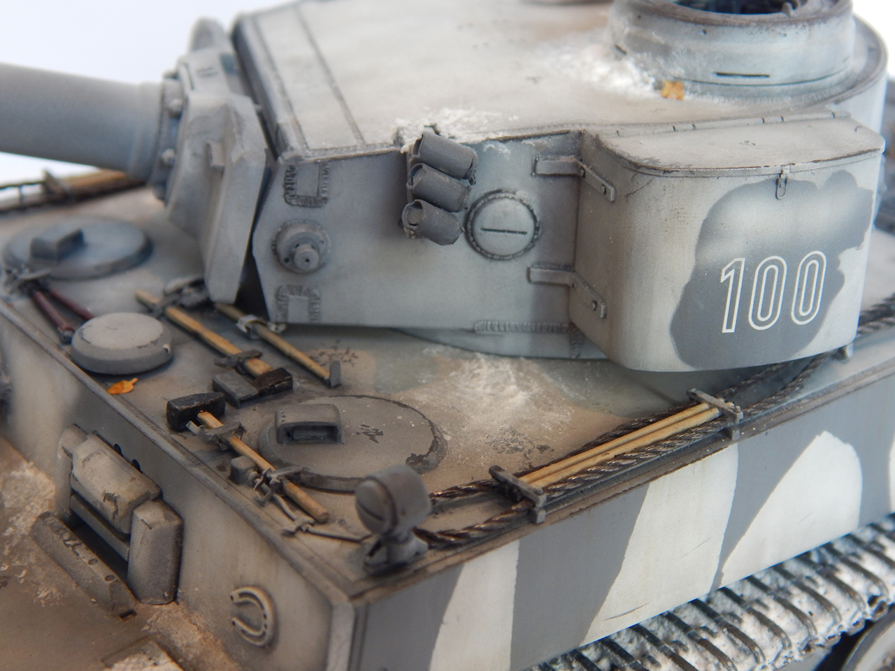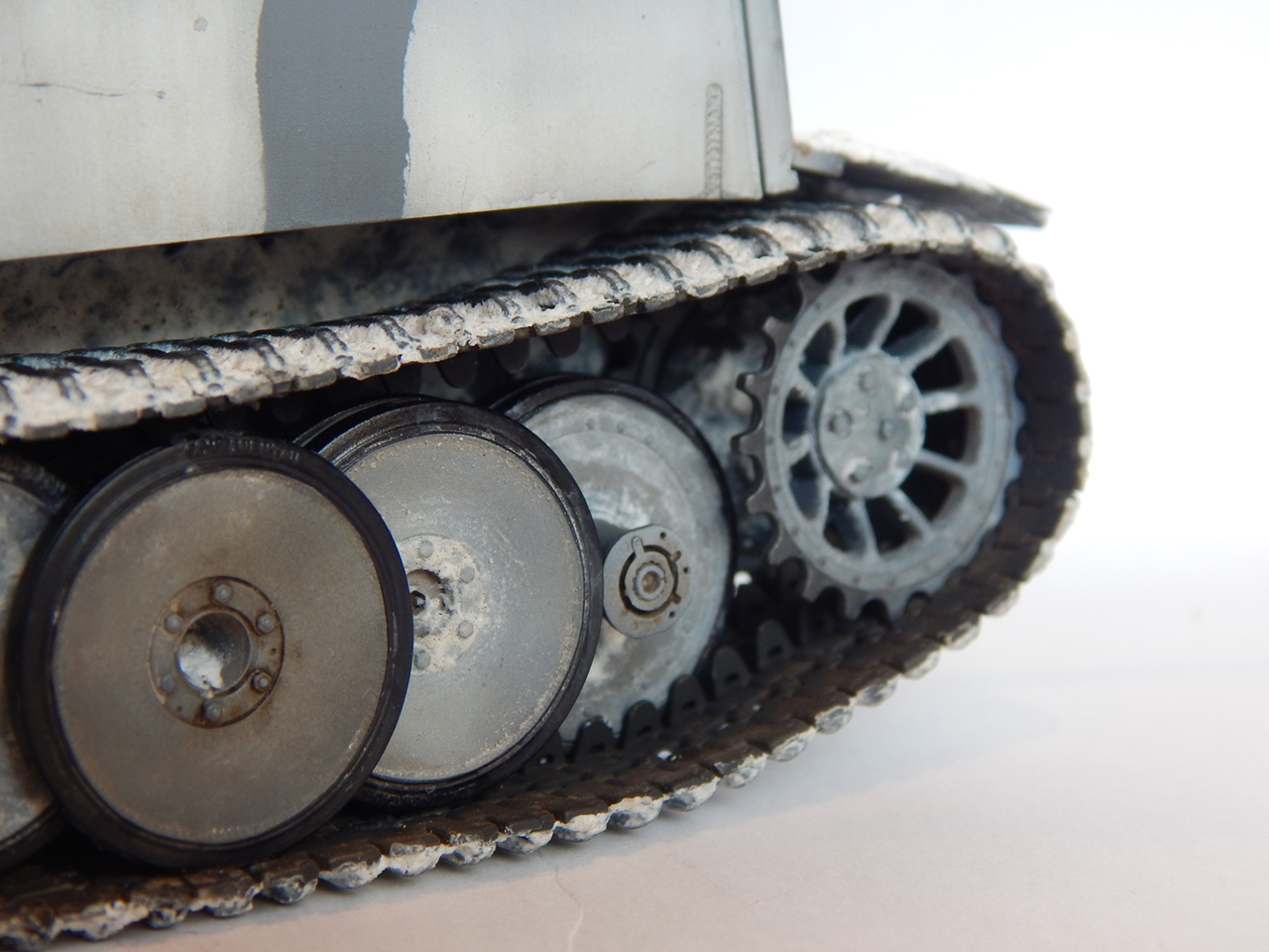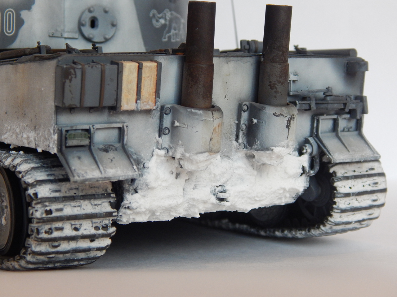 Покраску начал с грунта Mr. Finish Surfacer 1500, затем сделал прешейдинг Tamiya Rubber Black, задул в Dark Grey, сделал высветления Medium Grey. Камуфляж наносил с помощью масок из скотча и Patafix'а акрилом Flat White. В ходе окраски использовал самодельные фильтр и смывку, а также химию AK и Mig, Миговские и Вилдеровские пигменты, а также вилдеровский снег. Тряпка из салфетки промоченной в ПВА, листики фирмы ModelScene.