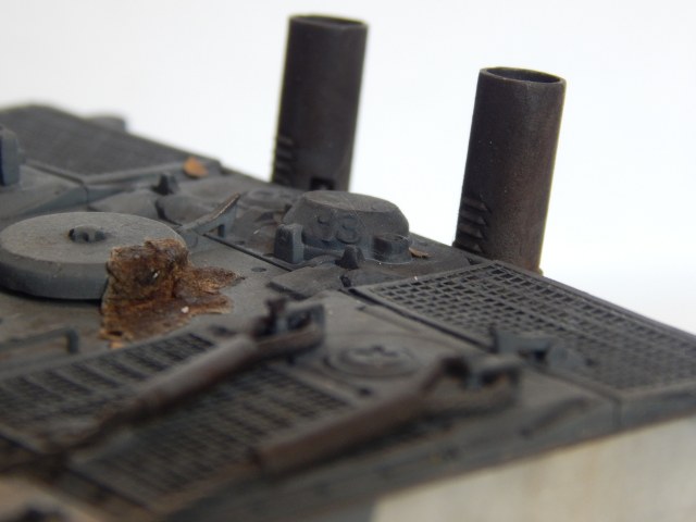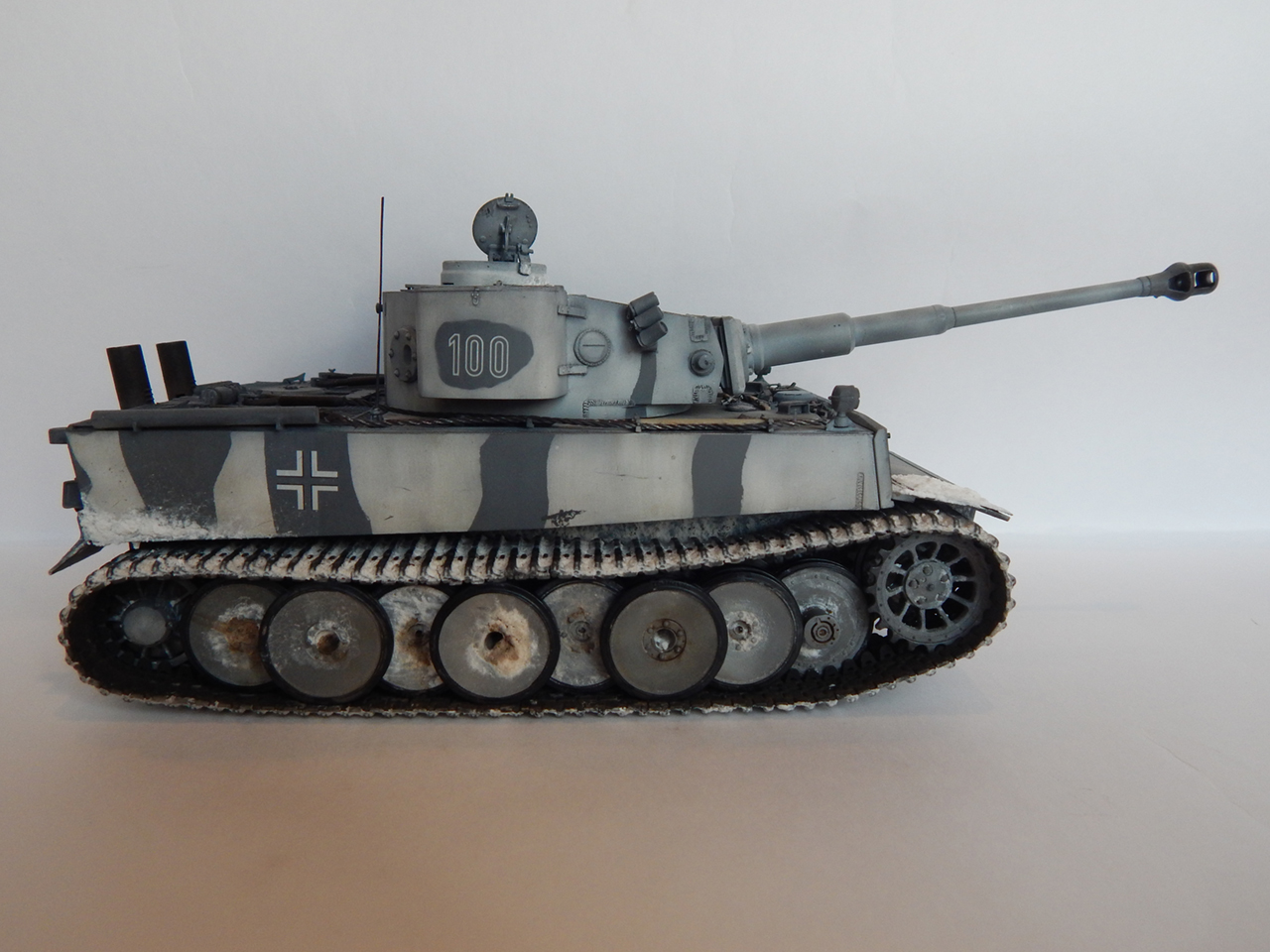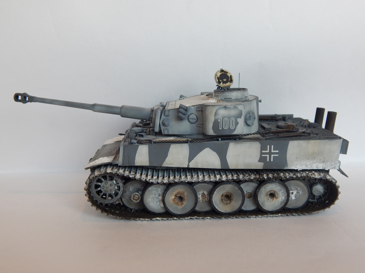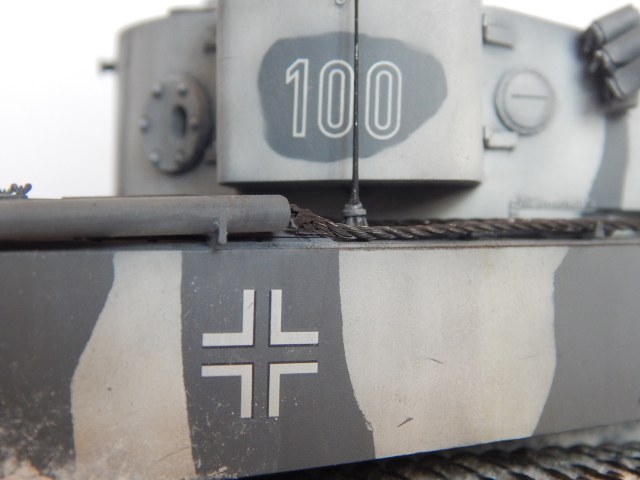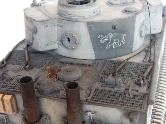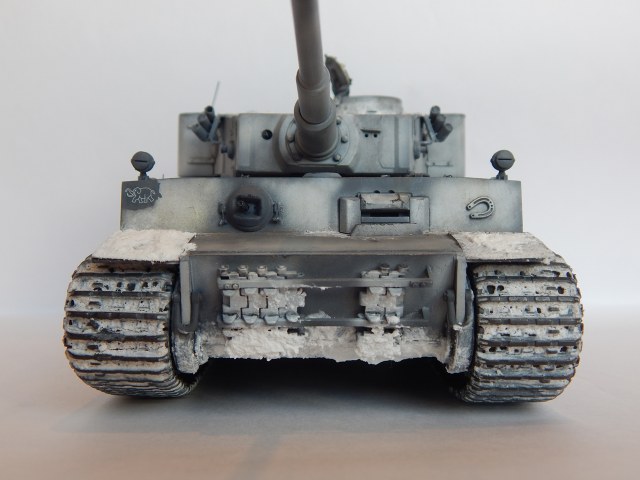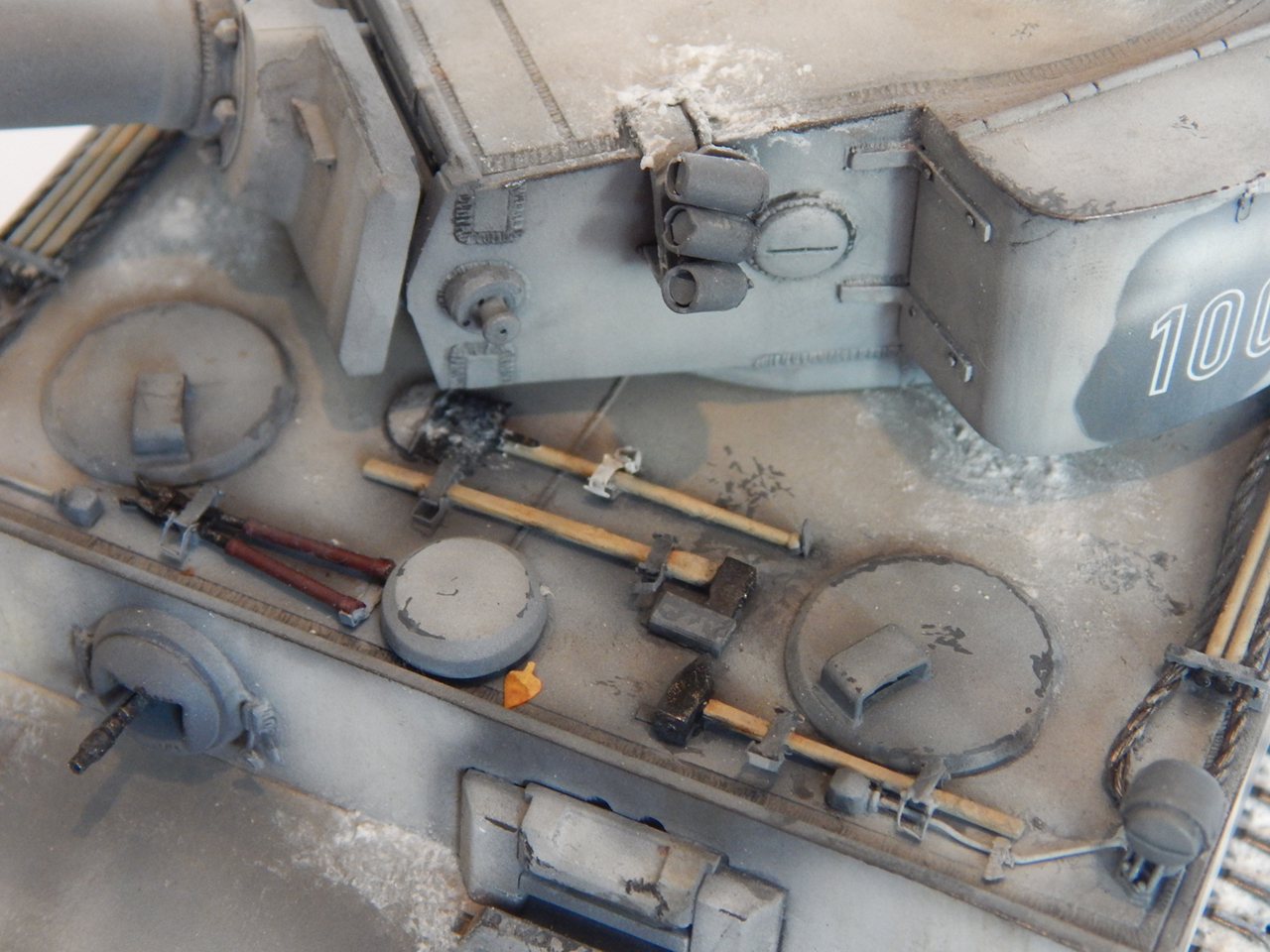 Покраску начал с грунта Mr. Finish Surfacer 1500, затем сделал прешейдинг Tamiya Rubber Black, задул в Dark Grey, сделал высветления Medium Grey. Камуфляж наносил с помощью масок из скотча и Patafix'а акрилом Flat White. В ходе окраски использовал самодельные фильтр и смывку, а также химию AK и Mig, Миговские и Вилдеровские пигменты, а также вилдеровский снег. Тряпка из салфетки промоченной в ПВА, листики фирмы ModelScene.