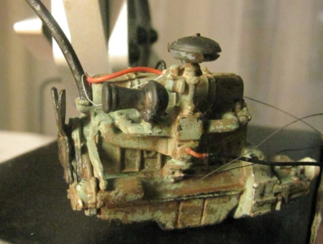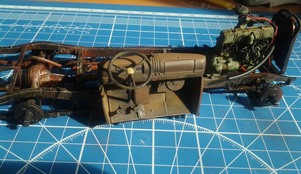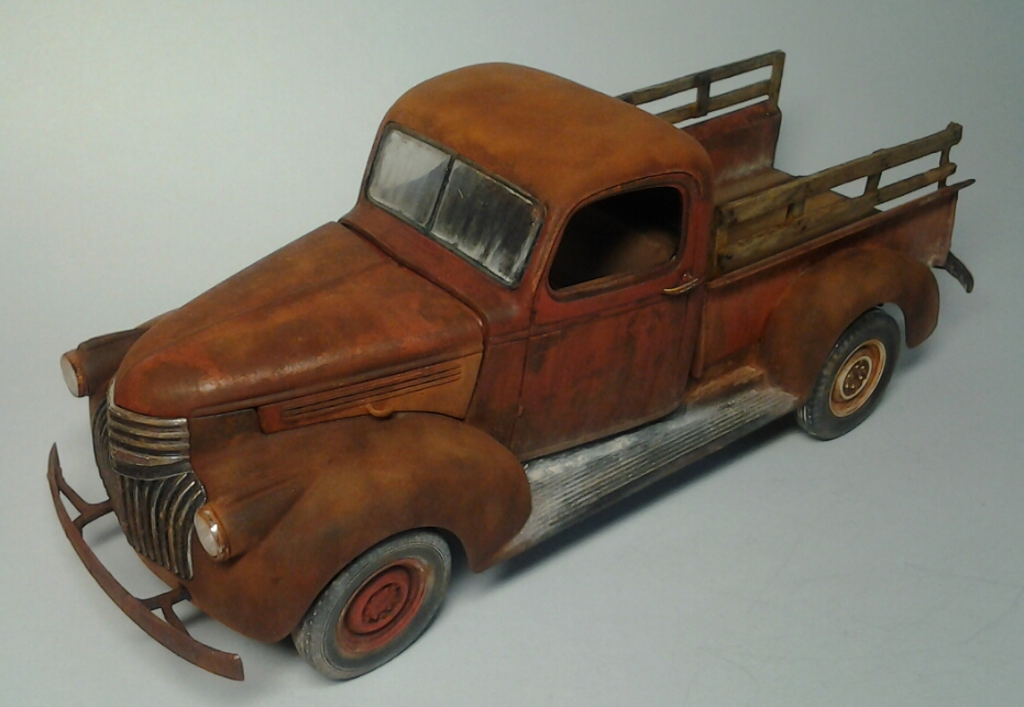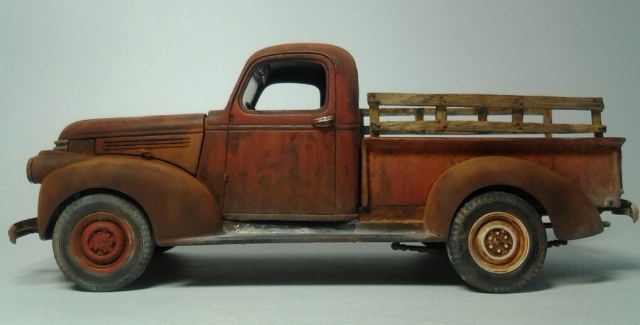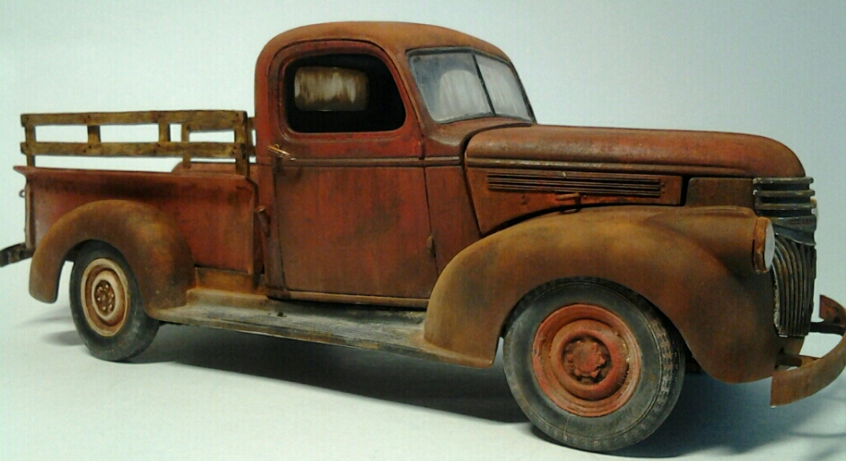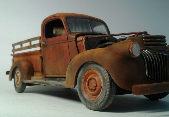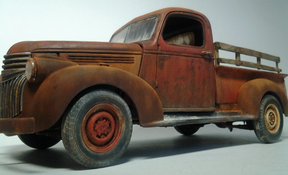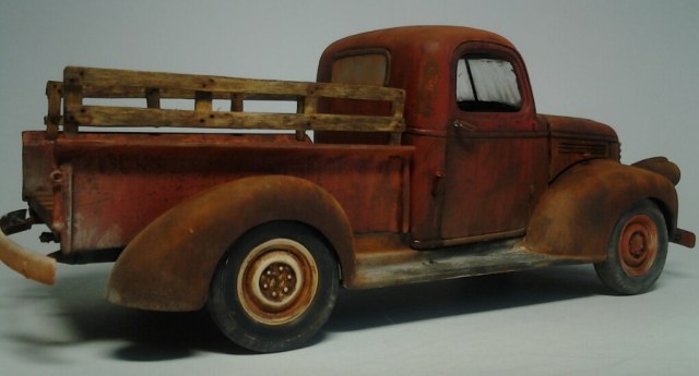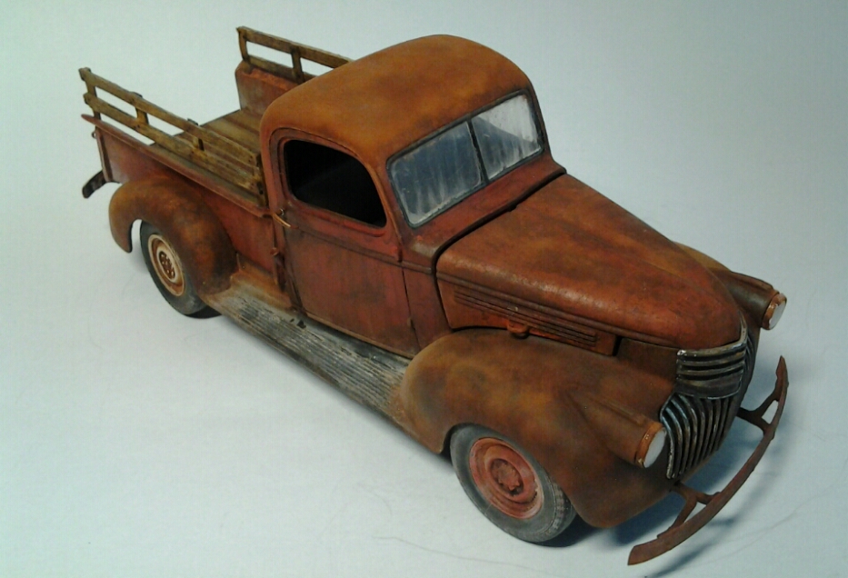 Здравствуйте, коллеги. Доделал пикап месяца три назад, только сейчас решил залить сюда фотографии. Между началом стройки и концом прошел год, но месяцев 9-10 он простоял без дела, это точно. Не было вдохновения. По качеству модель неплохая, стыковка хорошая, на "4" тянет точно. Другое дело, что требует доработок. Двигатель доделывал проводами и шлангами, без них оочень пусто. Хотел еще настил в кузове заменить на самодельный, но когда нет вдохновения, трудно что-то делать такое радикальное. Покраска акрилами тамия, маслом МиГ и Сонет, химией АК и разными пигментами. В работе еще один пикап, если народу интересно, могу стройку открыть...