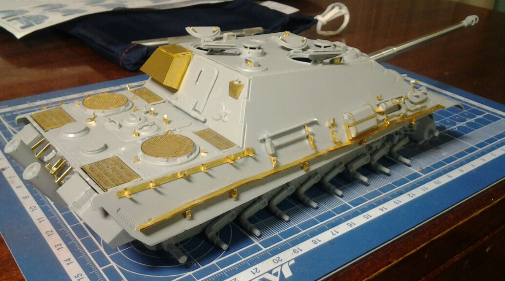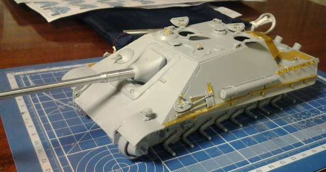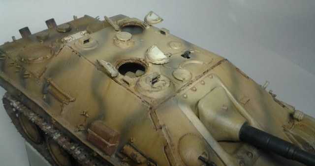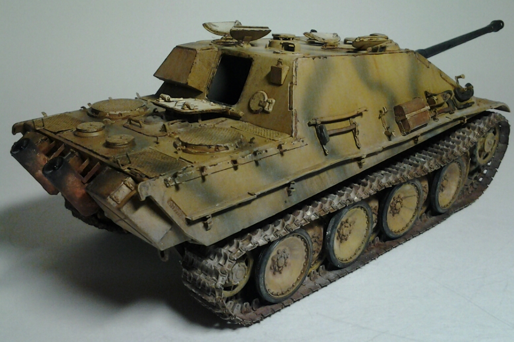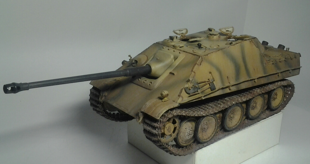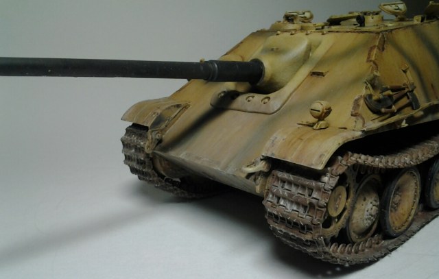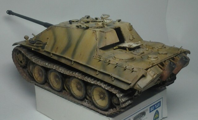 Полгода назад была закончена Ягдпантера от Дрэгона. В сборке модель хороша, а если не обращать внимание на плохую стыковку верхней и нижней части корпуса, то вообще отличная. Набор купил с рук подешевке с фриулом и стволом от абера, еще дополнил набором травления от вояджера. Окраска акрилами тамия, масляными красками МиГ, химией АК, разными пигментами. Возможно не хватает крупных планов. Надеюсь на Ваши комментарии. Спасибо.