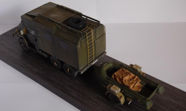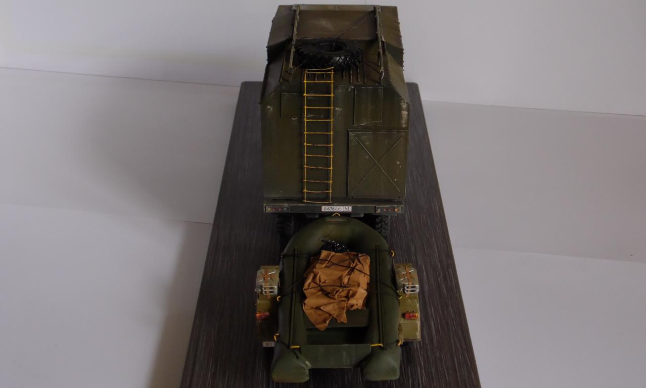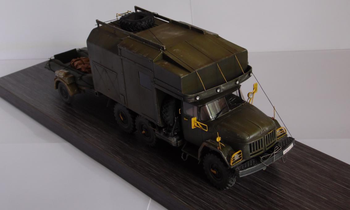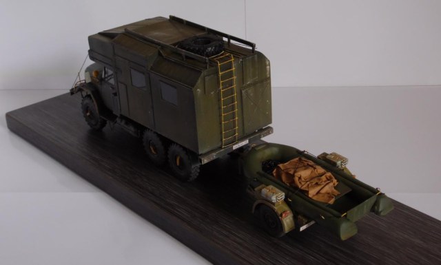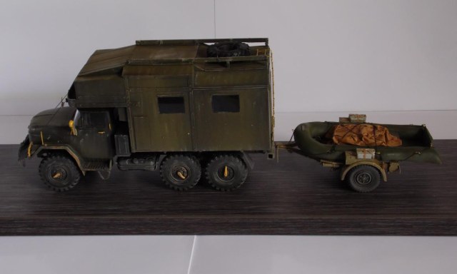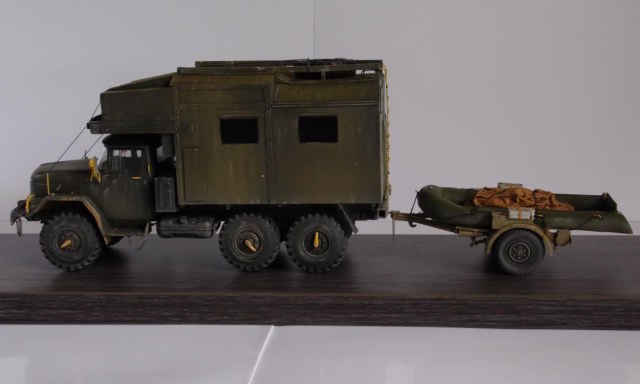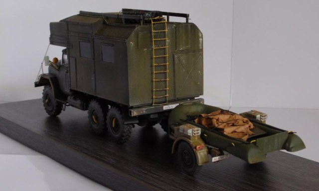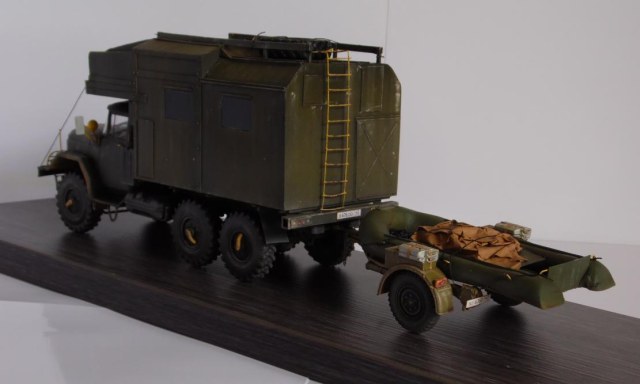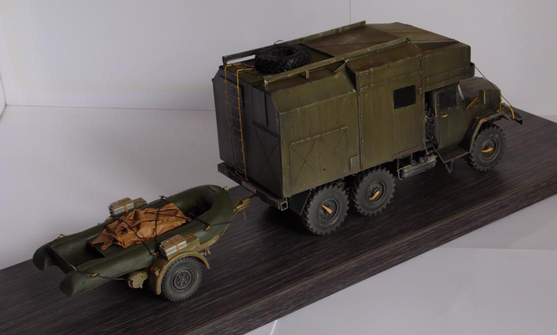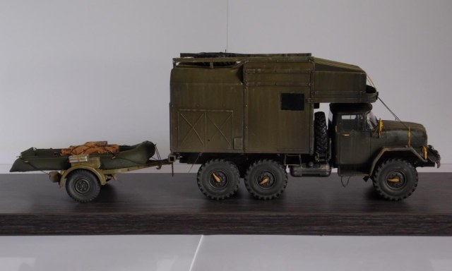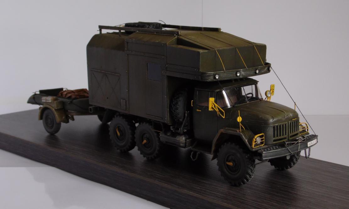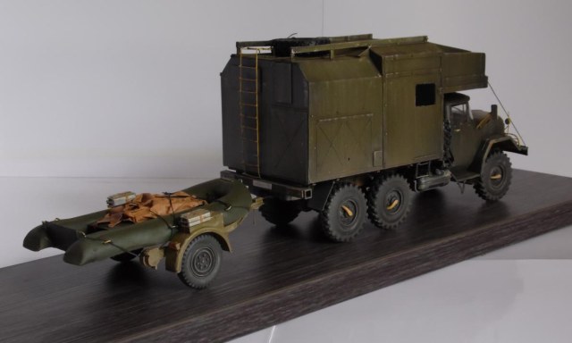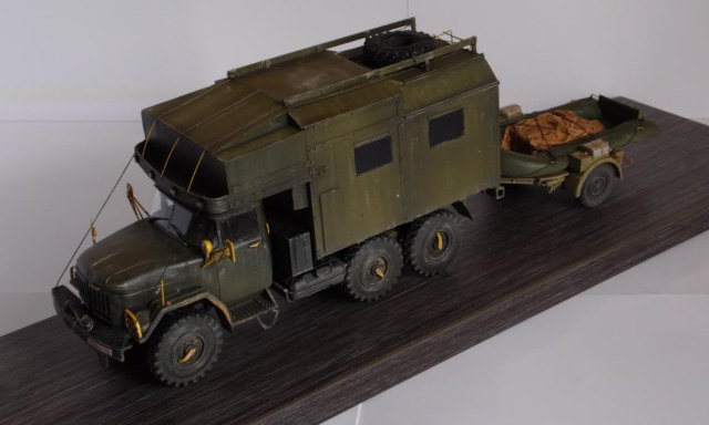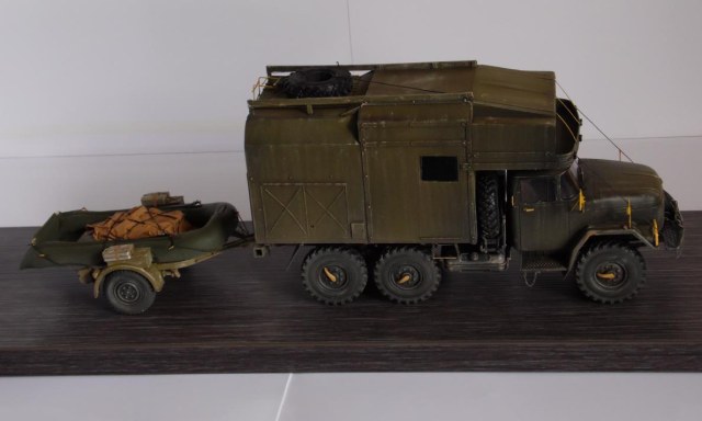 Шасси с кабиной ИСМ, прицеп немного перепиленная телега от Тамии, фургон и лодка самопильные. Фургон - пластик Евергрин, лодка - эпоксилин.