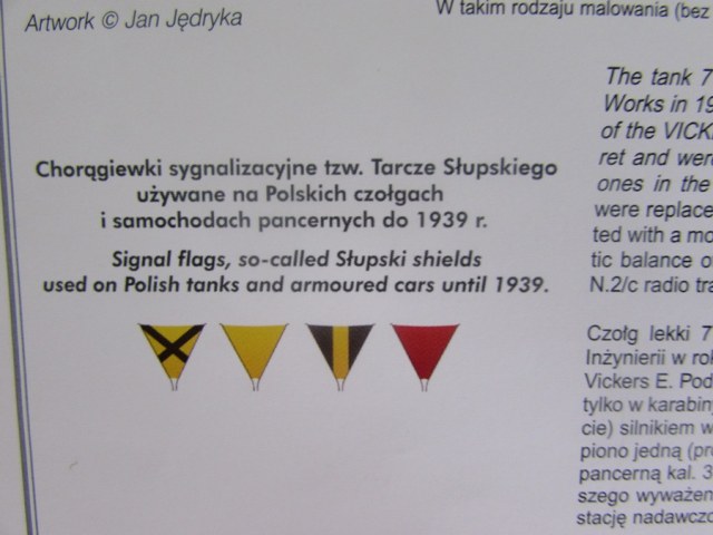 Декали на два польских варианта и один немецкий. Кроме инструкции, в коробке два цветных вкладыша с цветовой схемой для польских машин, на которых к тому же отображены сигнальные флажки, которые использовались польскими бронесилами. Флажки следует вырезать, (они двусторонние), и установить на модель. Схема установки сигнальных флажков присутствует на цветных вкладышах поменьше, при чем на них указаны все варианты для разных видов техники. Мне как всегда, не угодишь, - скачал себе брошюру Wydawnictwo Militaria, где больше информации по 7 TP , плюс много вариантов цветовых схем для польских и немецких вариантов).