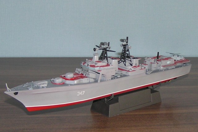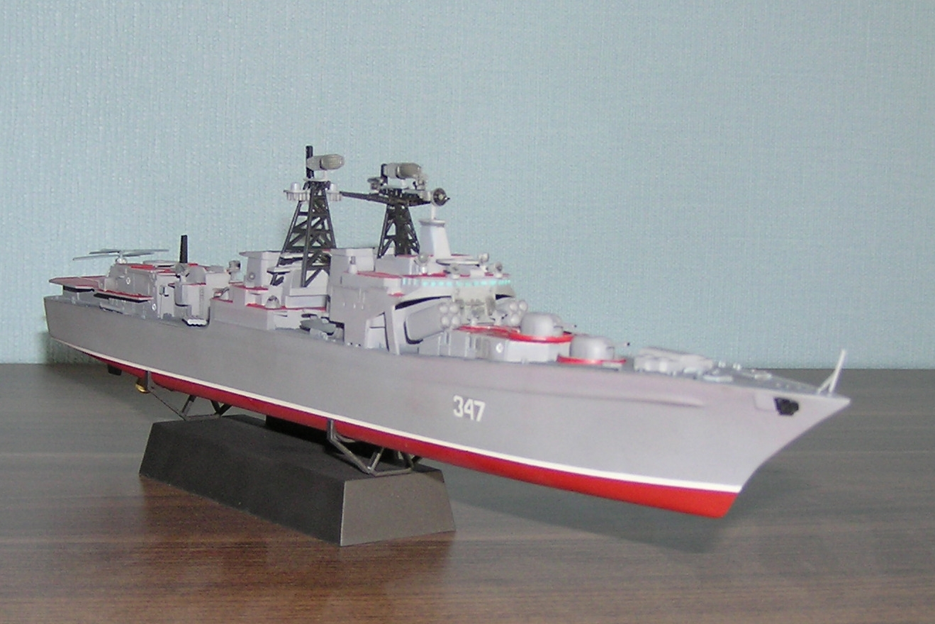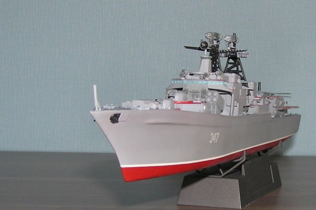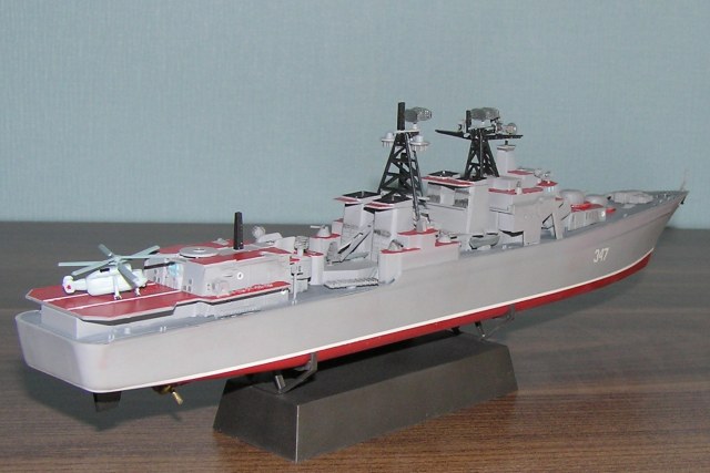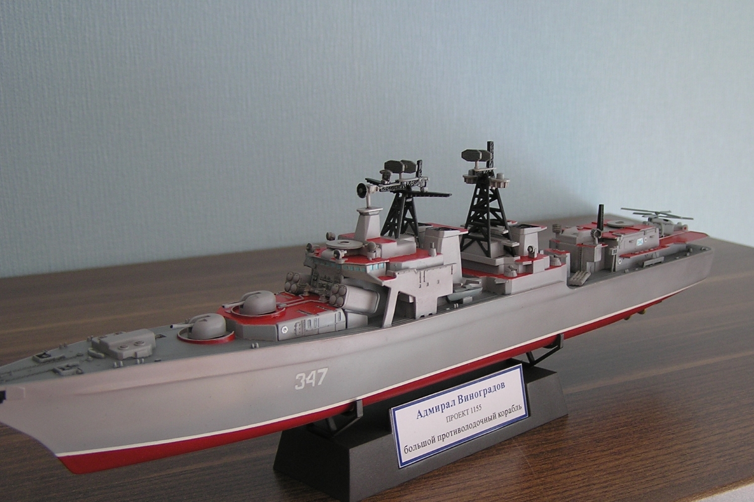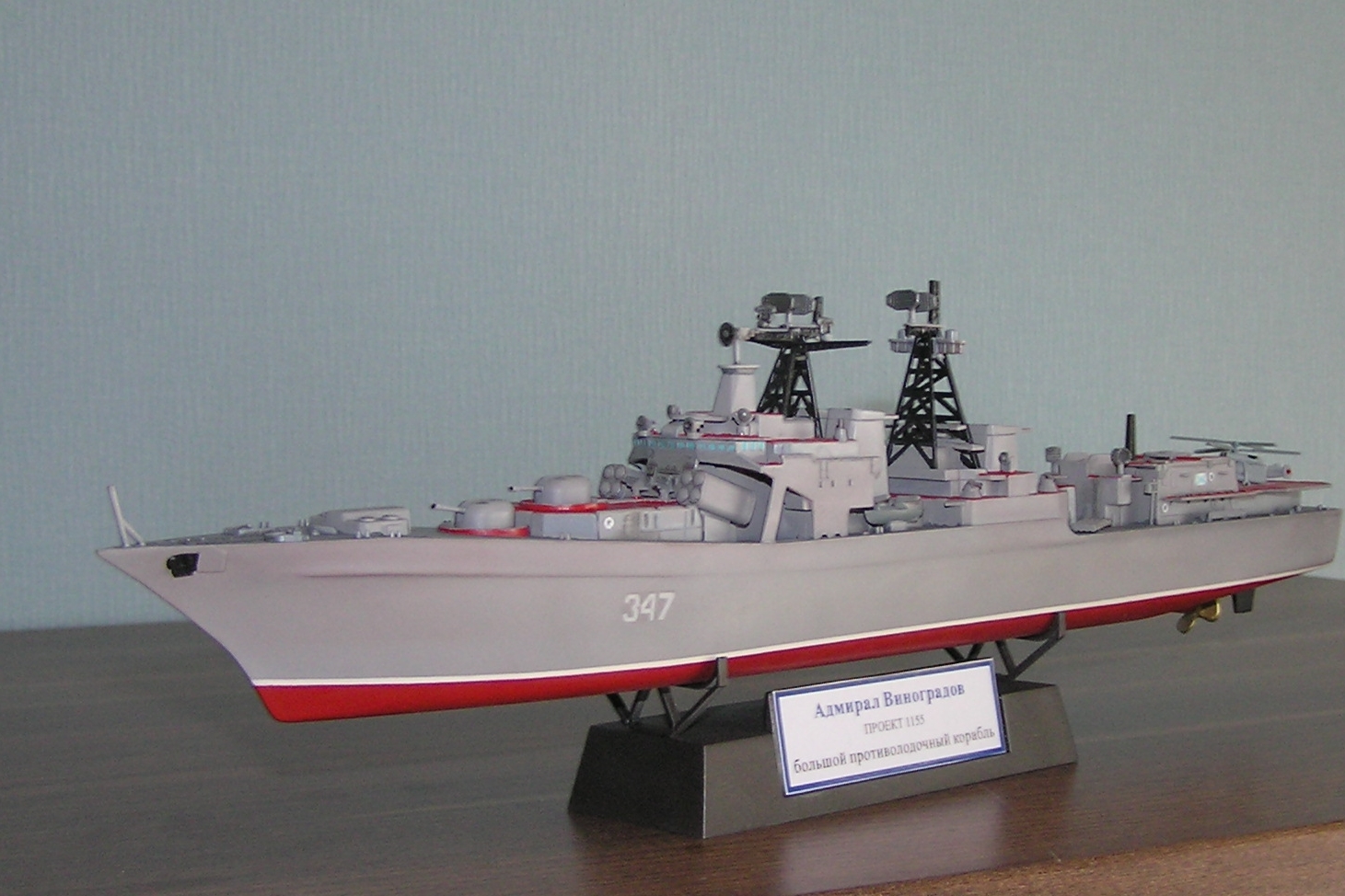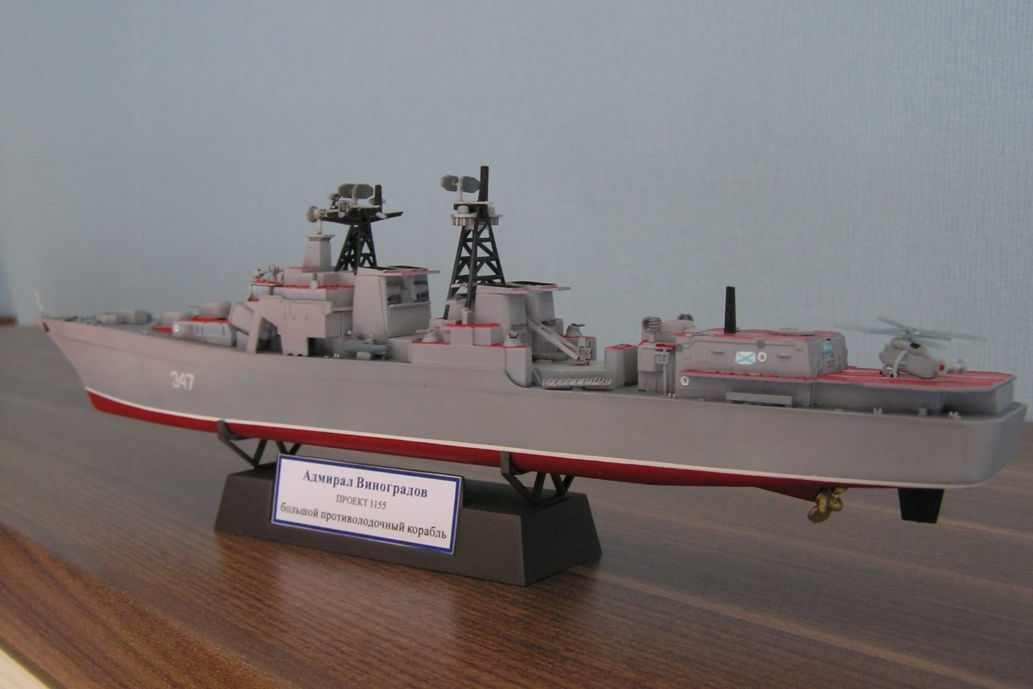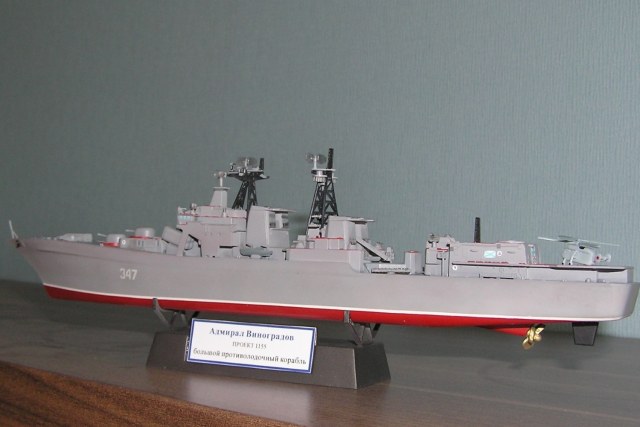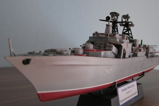 В 1/350 производит трумпетер ,а это какое-то беспомощное подобие без масштаба.Я думаю той фирмы|,которая на одном корпусе шлепает все: и 1155 и Тикондерогу.Игрушка,не более.Даже для "песка" не катит.Я так думаю.