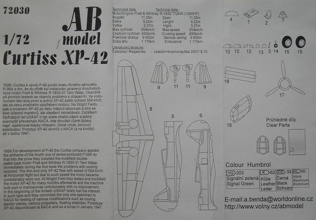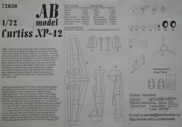 Модель из смолы от фирмы ABmodelв масштабе 1/72 (номер по каталогу 72030) упакована в картонную коробку с верхним открытием. В наборе представлен Curtiss Model 75S. Литьё среднего качества, присутствуют отдельные пузыри. Из откровенных недостатков - весьма плохо проработаны воздухозаборники на капоте. Ваку-фонари выполнены с нечёткими границами переплётов. Декали имеют, на мой взгляд, неправильный оттенок синего цвета. Инструкция достаточно наглядна и понятна.