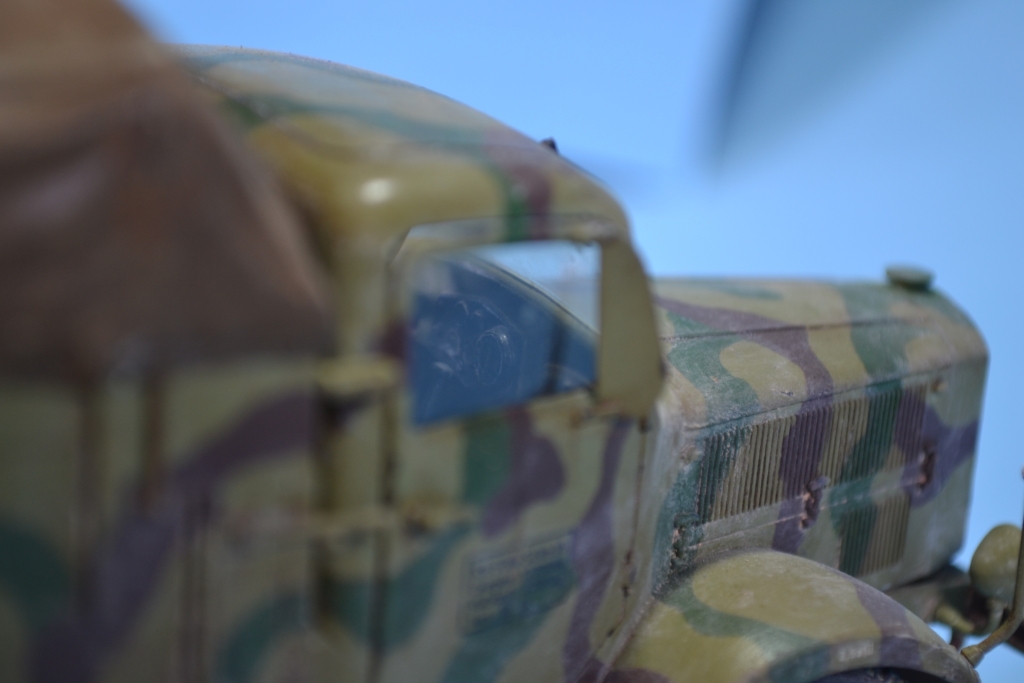 Понравился аккуратно нанесенный камуфляж,не понравился цвет и блеск тента,а также сетка "рыболовная" в кузове.Пыль какая-то белая,лучше пигмент использовать.