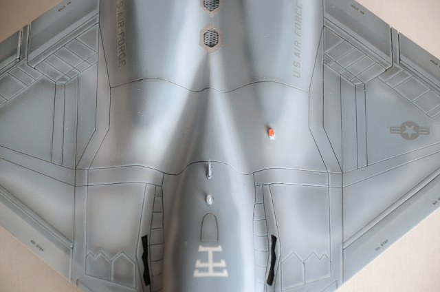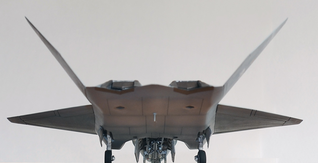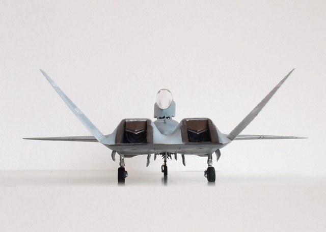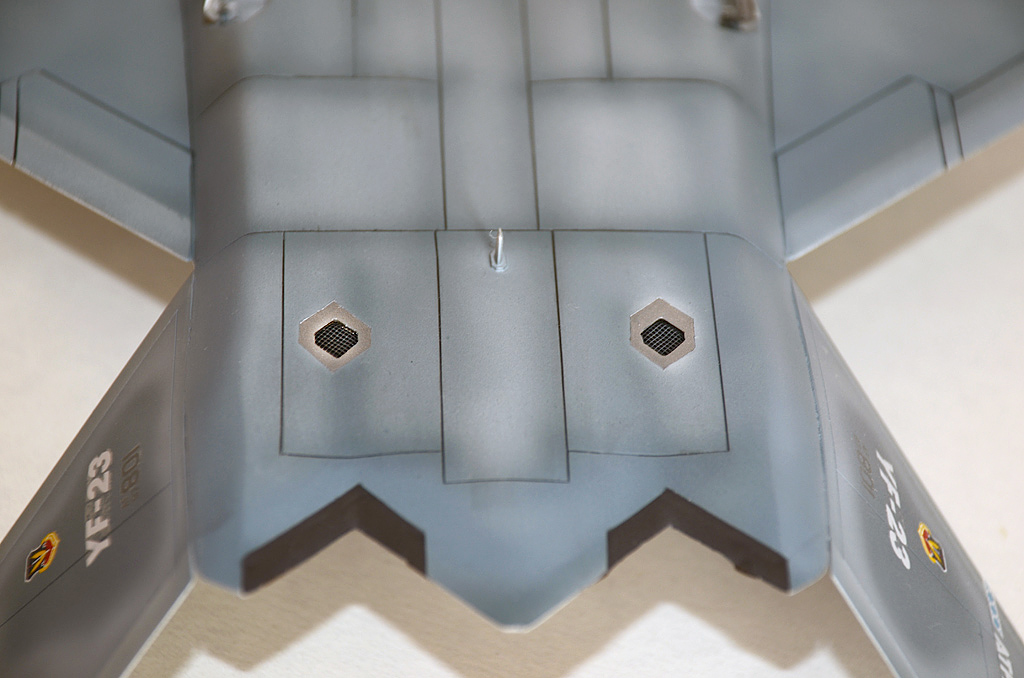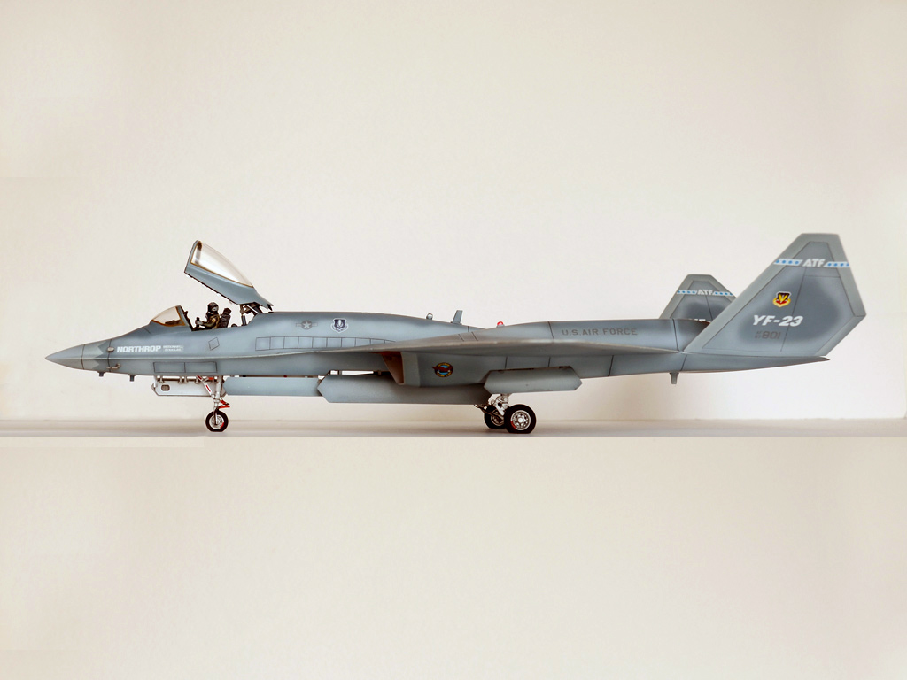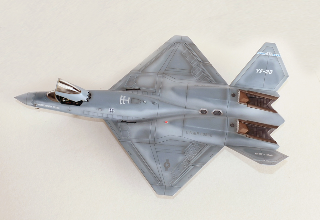 Я решил красить по второй схеме окраски, то есть YF-23 «GhostGrey». Было сделано немало доработок. Прочитав в сети кучу разных материалов про этот самолёт, решил доработать модель, сделав некоторую переходную модель между конкурсной и предсерийной (если бы он выиграл конкурс на ATF).