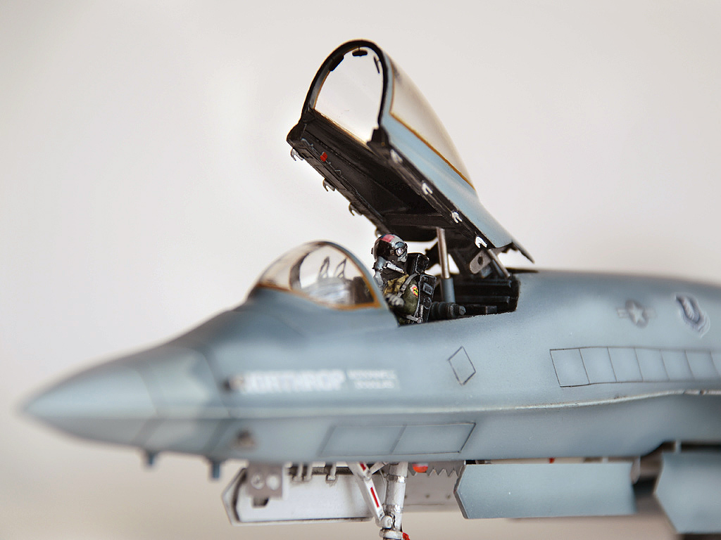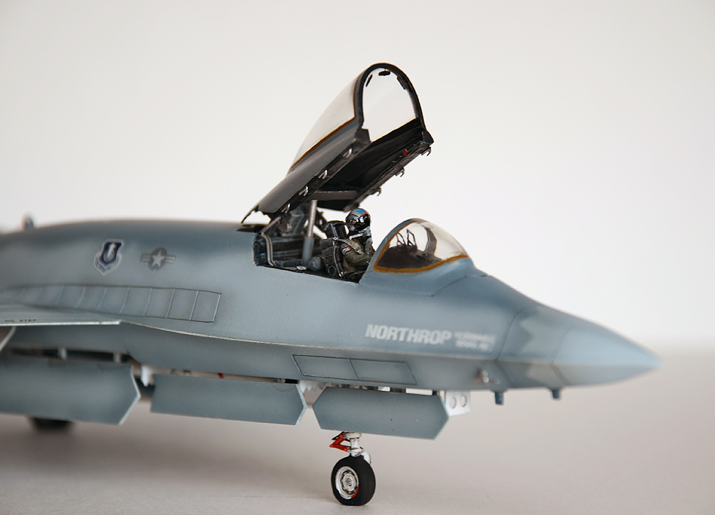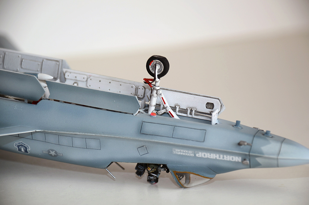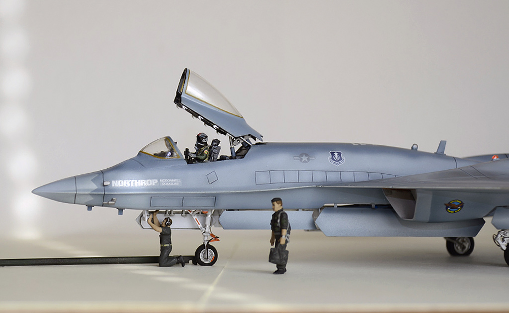 А ещё где-то (жаль не сохранил информацию) вычитал, что хотели на серийном заменить фонарь на более каплевидный, выпуклый, для улучшения обзорности, опять-таки как на F-15D. Пришлось рыться в запасах, склеивать кусочки прозрачного пластика и самому вытачивать новый фонарь. А это, скажу я Вам, оказалось не так уж легко. Но после шлифовки, Футура сделала своё дело, и фонарь заблестел. Долго всматривался в фотографии механизма подъёма фонаря, постарался воспроизвести и его. Ну естественно пришлось нарезать расшивочку внутреннюю, так как везде была внешняя. Фигурка пилота из набора Hasegava. Ремни –травление из запасов. Проблесковые из шпажек для канапе + футура. Покраска аэрографом, эмаль Humbrol. Так как модель старая, декаль развалилась в воде на множество мелких кусков. Пришлось по кусочкам вылавливать из блюдца и собирать воедино. Так что кое где есть серебрение, но это как раз из-за того, что трудно было все кусочки усадить на своё место, да ещё и приварить.