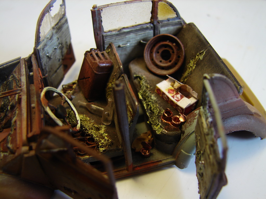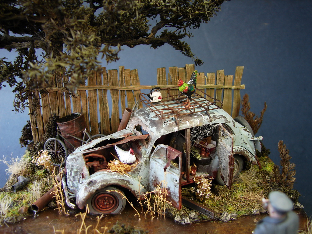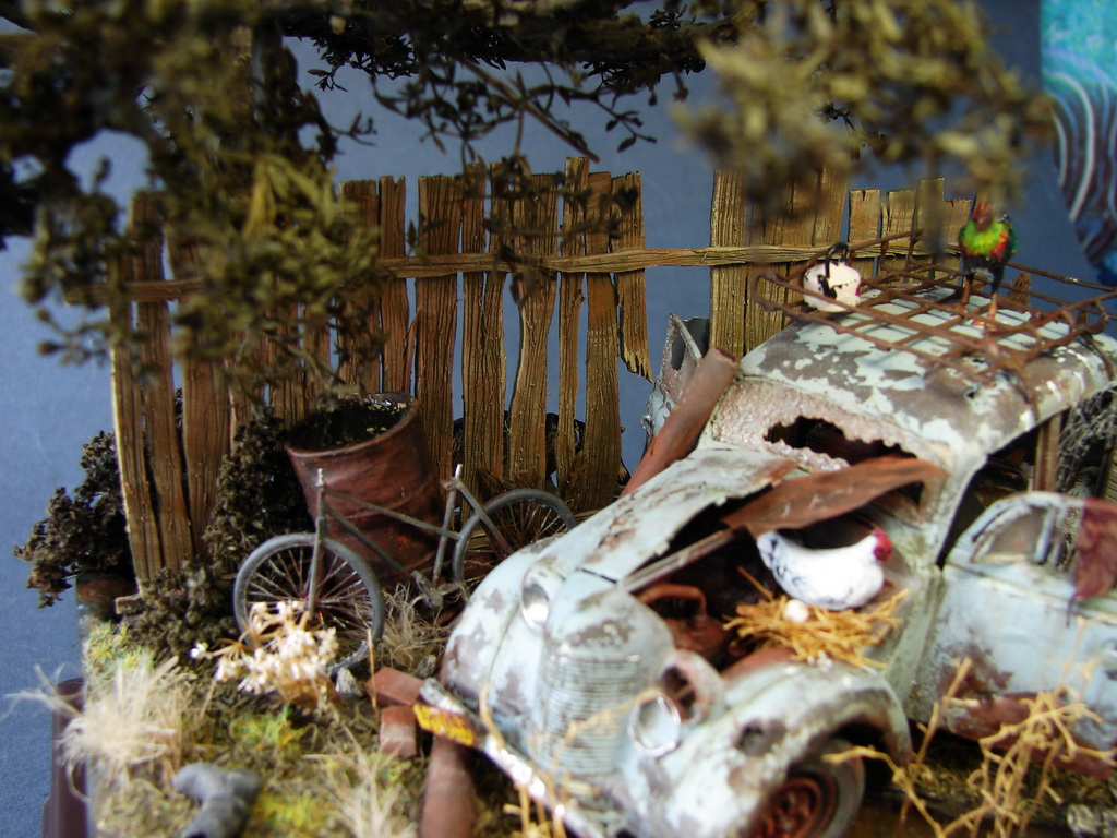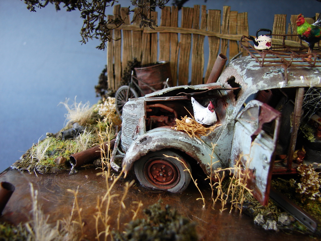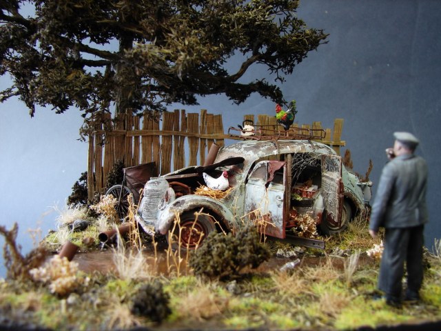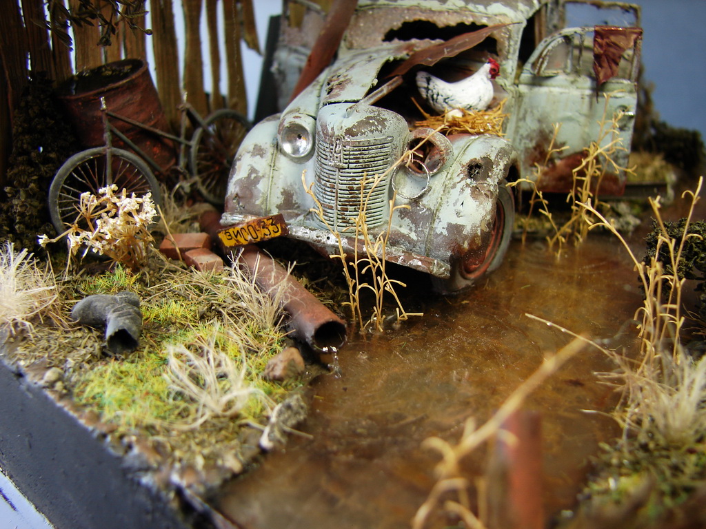 На фоне всей фигни,что происходит вокруг,решил сделать вполне пацифистскую маленькую диораму.)Сюжет вырос вокруг анекдота.Москвич пришлось "слегка" доработать.)Дерево из "ковыля" который нашел под ногами и законсервировал в глицерине прошлым летом.Вода-кусок пластика покрытый лаком.