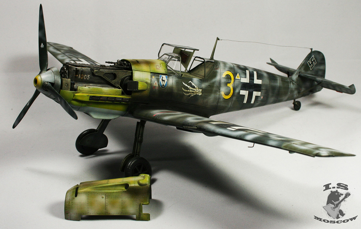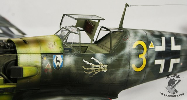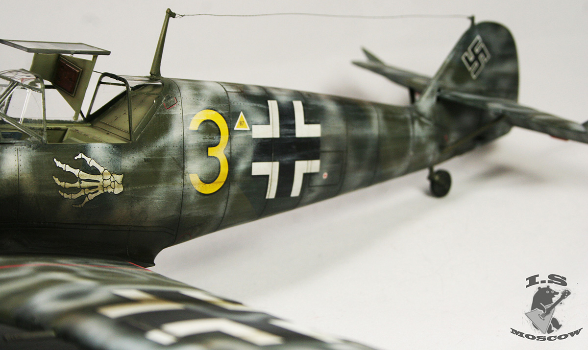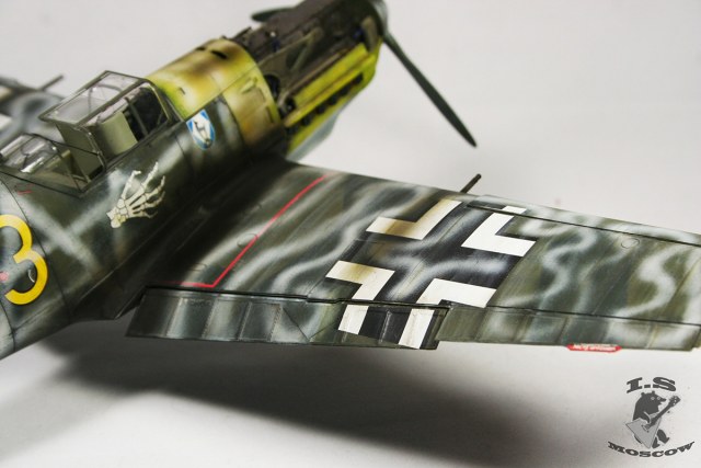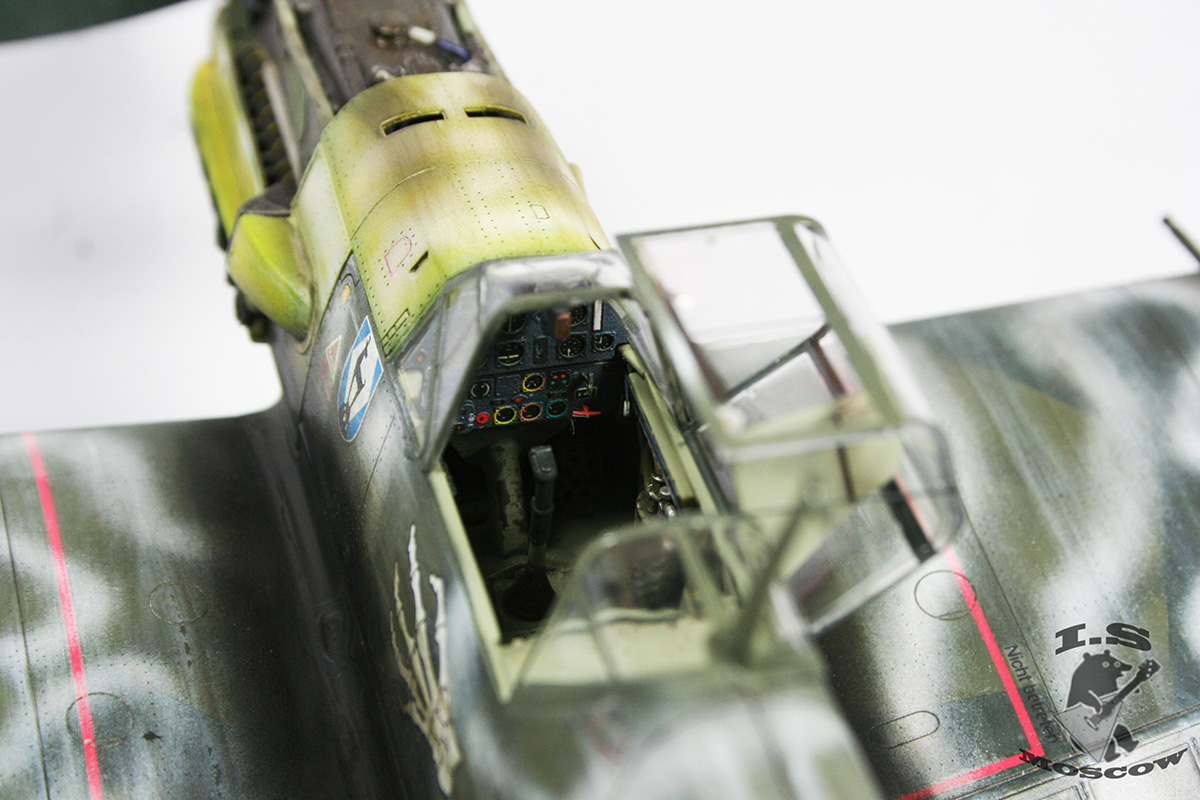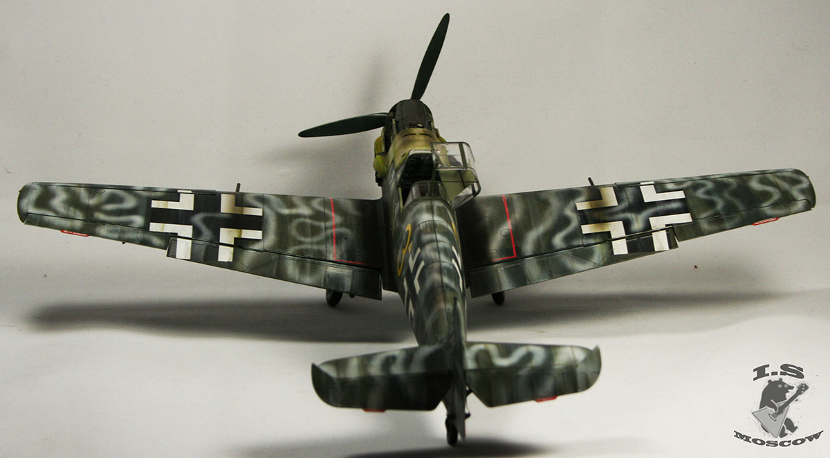 Мало слышать о художественных приемах, нужно уметь их применять к месту и в разумных пределах. Прешейдинг, который так яростно защищал автор, просто убил модель и превратил её в забавный тетрадный лист, похожий на мессершмит. Желание поиграть в крестики-нолики на крыльях просто неописуемое) Желтый цвет просто напросто ушел в зеленый, и никакая это не игра теней, это просто не закрашенная краска и непонимание основ покраски. Точно так же камуфляж верхних поверхностей превратился, из-за излишнего контраста в темно-серую массу, поверх которой накрашены полосы белого цвета, причем с совершенно жутким распылом и брызгами по бокам. В 32ом масштабе это смотрится смешно. Не украшает модель копоть, одного цвета с грязью на щитках шасси. В общем что я могу сказать - художественной составляющей не добиться путем делания "не так как все". Стоит, иногда, прислушиваться к советам. С менее контрастным прешейдингом, более "цветастой" загрязненностью и чуть более светлыми цветами основного камуфляжа модель бы смотрелась куда красивее, а не как нечто желто-серо-белое в клеточку.