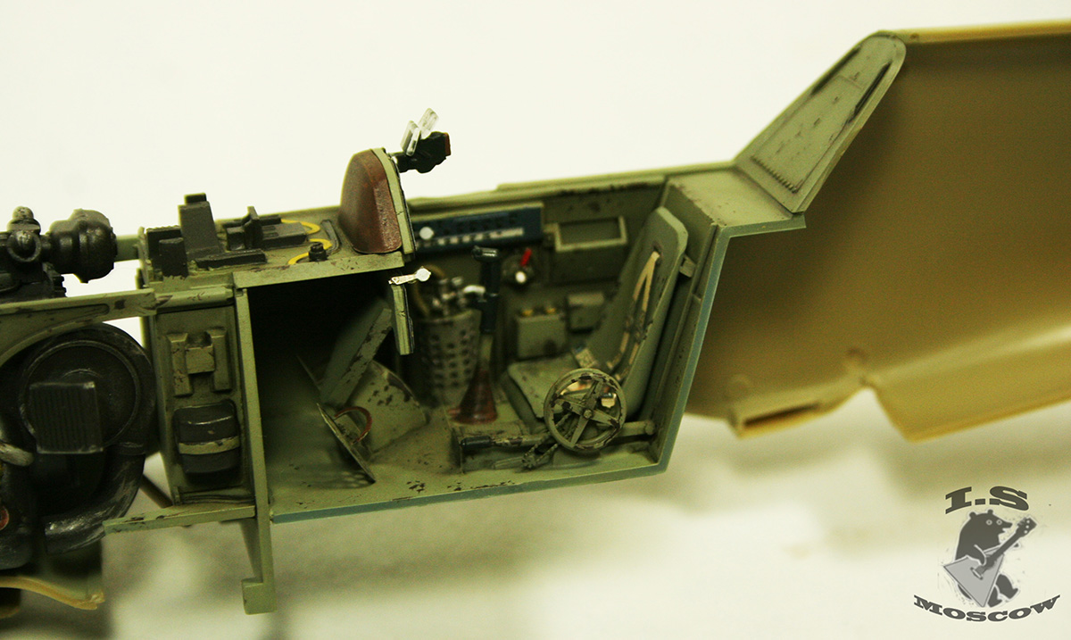 Наблюдал я за стройкой этой модели с самого начала, в вконтакте, благо автор активно освящал постройку. На стадии перед покраской это была довольно аккуратно собранная модель из коробки,с довольно красиво покрашенной кабиной, хоть и бесконечно слабой по деталировке и проработке мелочей для такого крупного масштаба. Решение автора показать совершенно "лысый" двигатель оставлю на его совести, в конце-концов - почему бы и нет? Ведь основной упор, как говорит автор делался "на художественную составляющую." Так что все несоответствия матчасти я оставлю в стороне. И позволю себе высказаться на счет художеств.