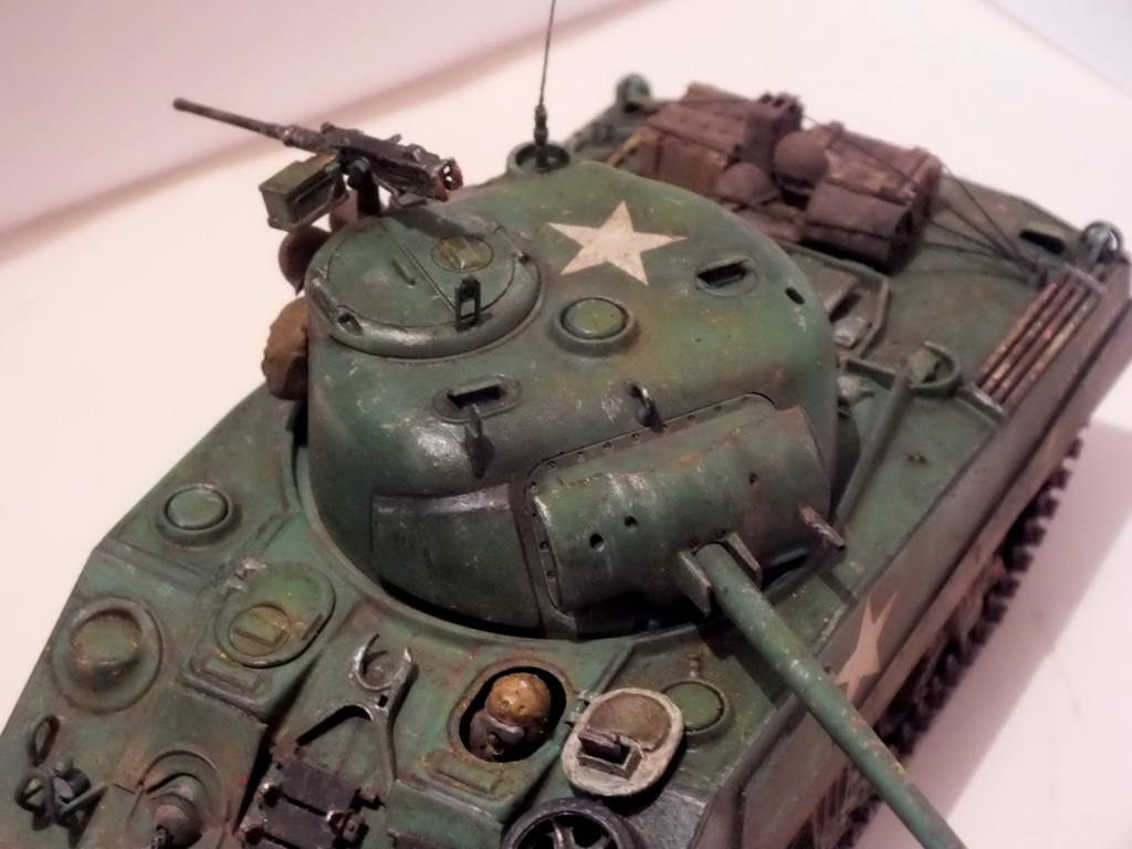 Мне кажется, что Ruspatriot черезмерно категоричен. Модель не шедевр, но вовсе не плоха. Машина вышла вполне узнаваемой, покраска и такая имеет право быть, так что "песок" это тут зря. Да, в цветной хронике американская броня значительно светлее, именно как консервированные оливки - только не забывайте о проблемах цветопередачи того времени и о высветлении плёнки.