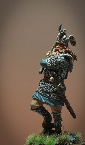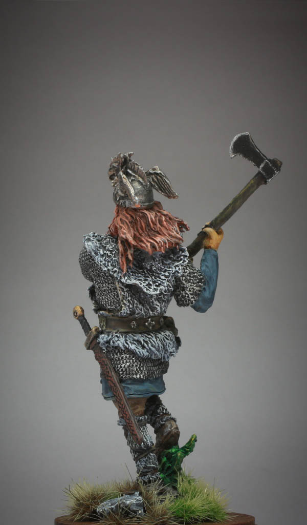 Масштаб 1/35 не большой и не маленький, но самый распространенный и люди в нем делают вещи. Не понравился шлем (спереди смотрится очень громоздко), ножны (наверное неточности литья, нужно было доработать), поворот топора (куда-то он не туда смотрит на 1-м фото), шкура (сливается с кольчугой). А так интересно, аккуратно.