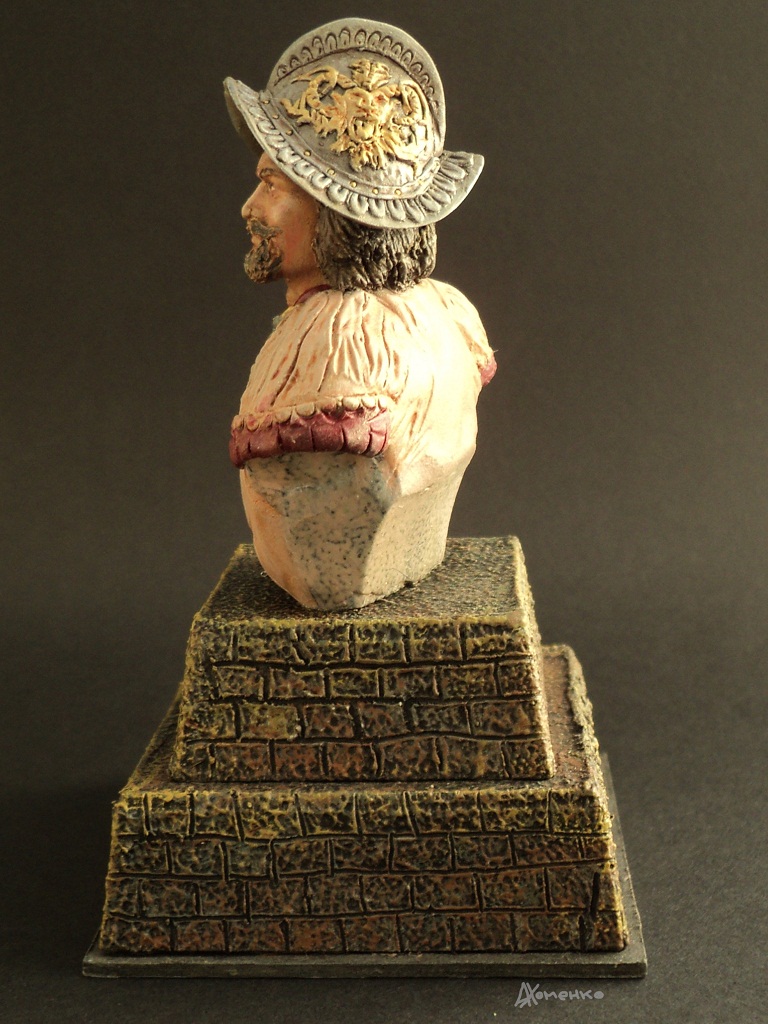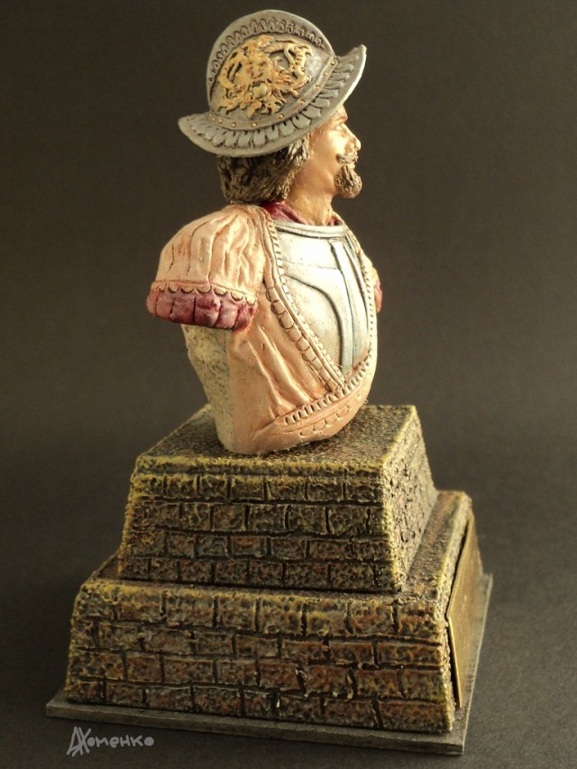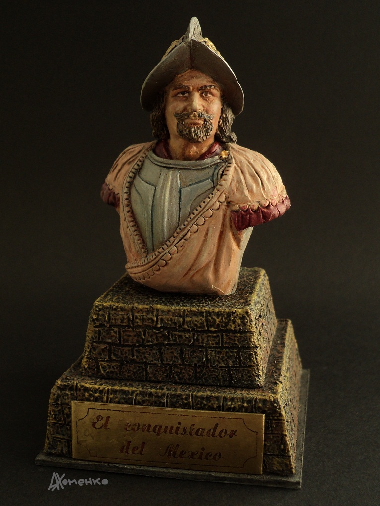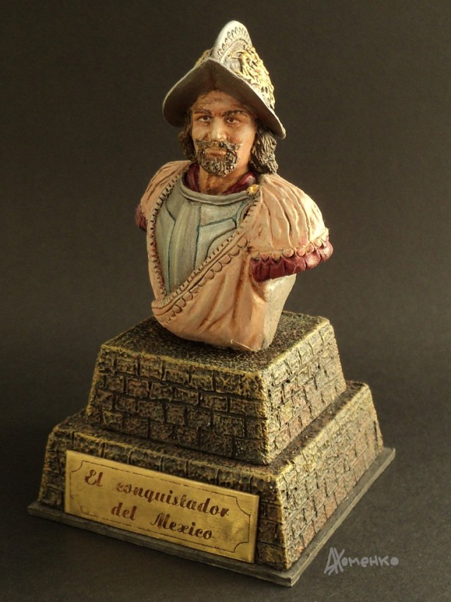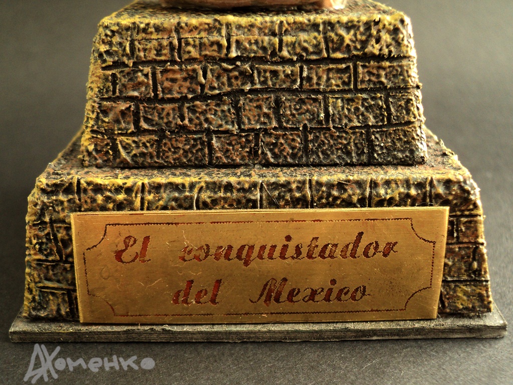 Эту фигурку делал как конверсию из старой, советской еще, фигуры зверобоя. Обрезал его, скопировал в смоле и долепил нужное. Прототипа как такового нет. Шлем "морион" не характерен для эпохи завоевания Мексики, но уж больно красиво смотрится. Подставка в виде ступенчатой пирамиды склеена из картона и доработана шпаклевкой по дереву. Табличка изготовлена методом фототравления. Роспись- акрилом.
