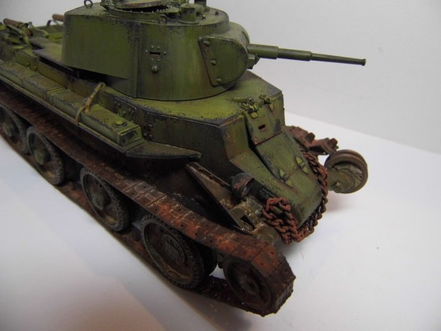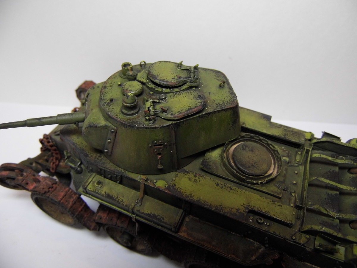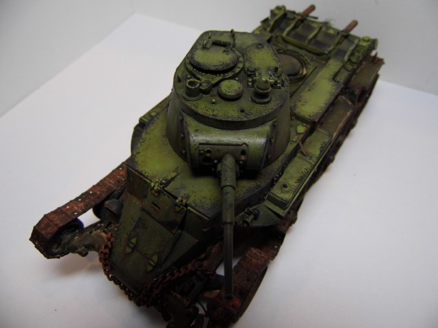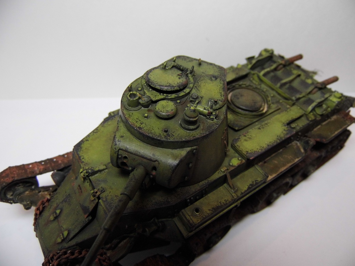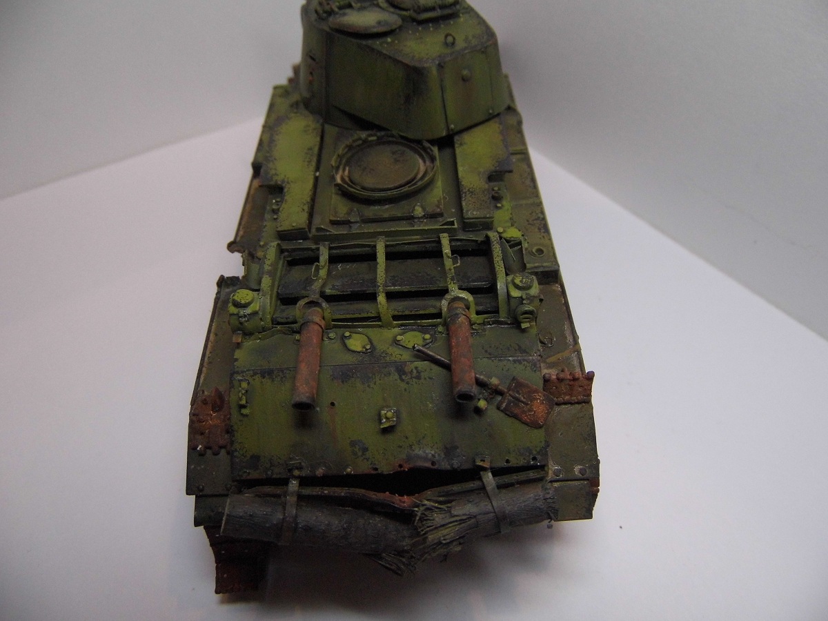 курсовой пулемёт.домкраты-сняты,разве что цепь-но с ней сама модель круче смотрится(на мой взгляд),движка разбита снарядом.А на счёт ржавчины-я думаю не горевший танк довольно долго не ржавеет,даже то что я сделал на этой модели-чересчур.
