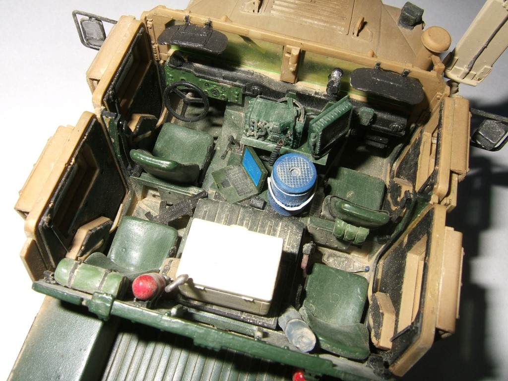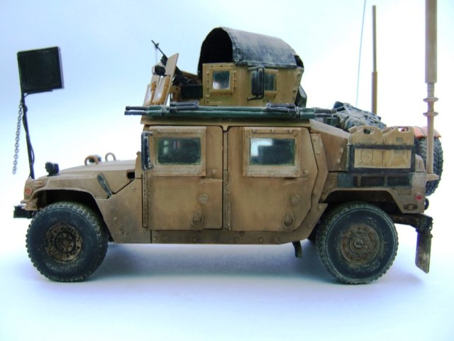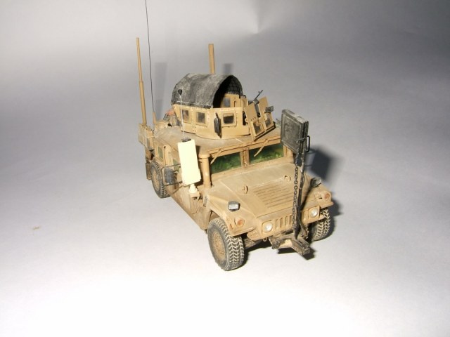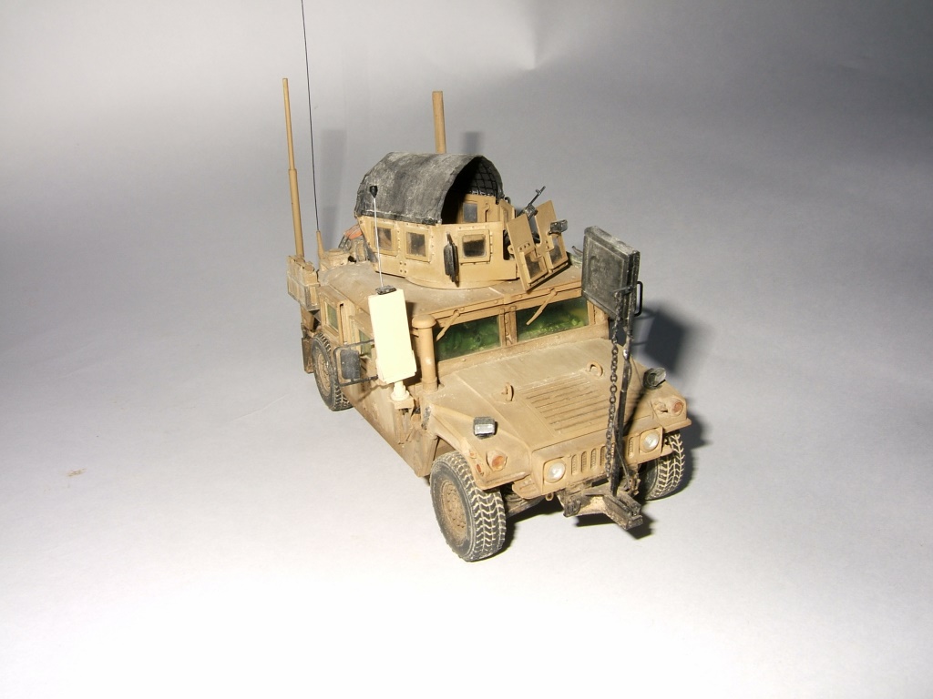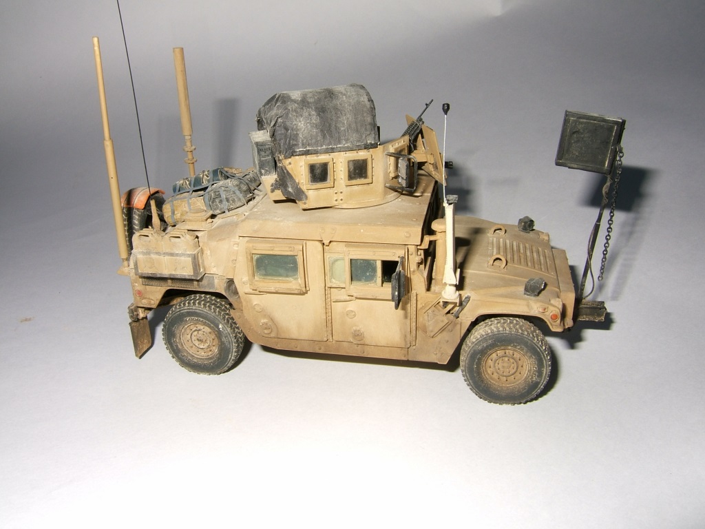 Здравствуйте, представляю вам модель достаточно известной модели. Прототипа конкретного - не было, сделал собирательный образ на основе фотографий с Афганистана, Ирака. Модель из коробочная с добавлением всякой самодельной и не только мелочевкой. Из самодельного были добавлены были ремни, провода, козырки, видеокамера, антенна Crew Duke, жёсткая сцепка, основание для "флага", ноутбук. Красилась модель тамией и Lifecolor, MRhobby. Пигменты АК и Миг.