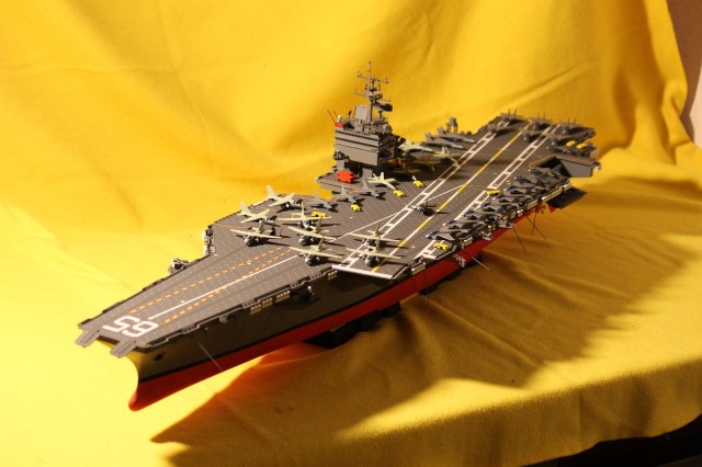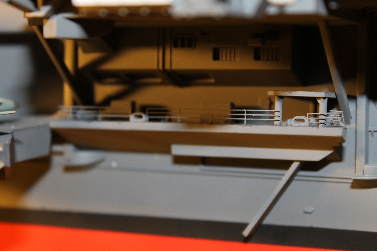Собирал "из коробку". Из дополнений использовал фототравленые леера фирмы "Eduard". На мой взгляд, не совсем подходят для данного экземпляра, но искать и заказывать "родственное" травление от американской фирмы было бы накладным и дорогостоящим. Стыкуемость деталей хорошая, пришлось повозиться только со шпаклеванием и выравниванием деталей палубы. Лифты сделал подвижными, т.ч. в любой момент можно чуть изменить статичность модели. Остеклил палубную надстройку.