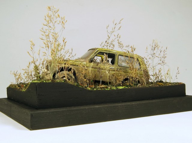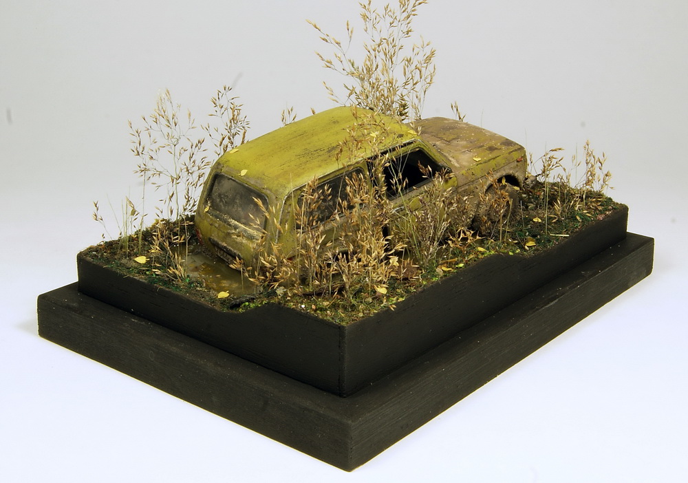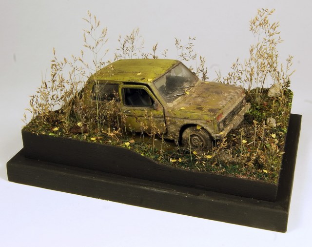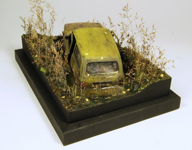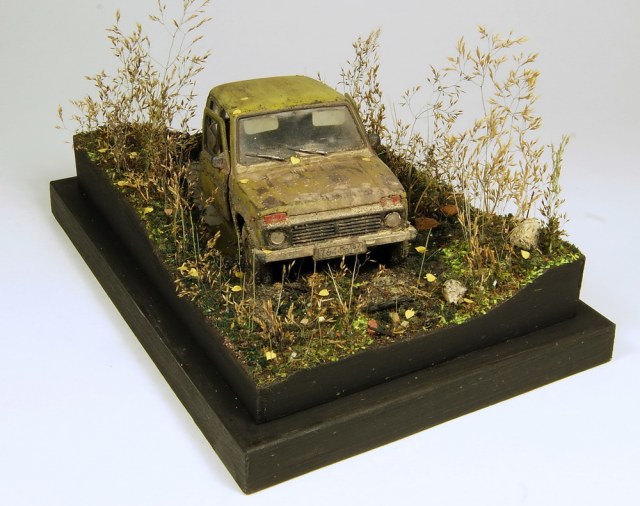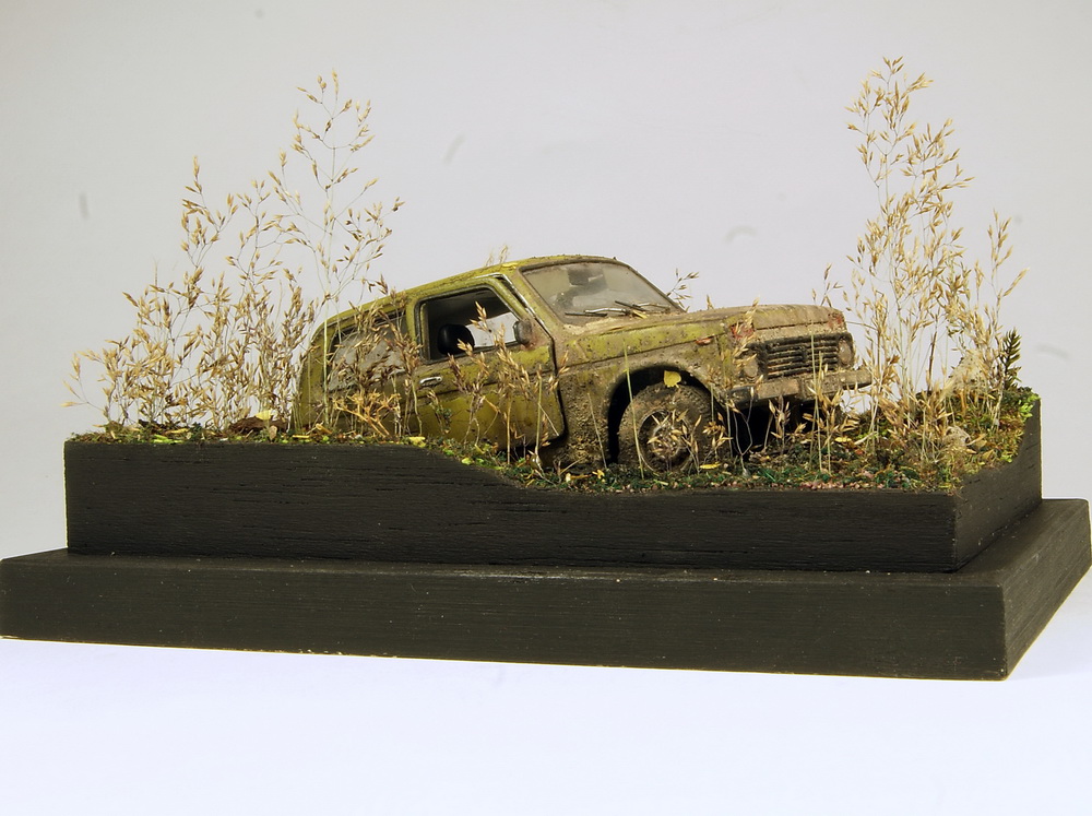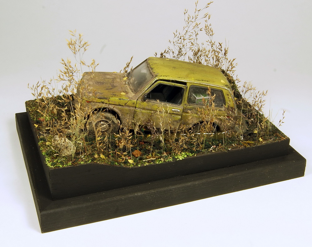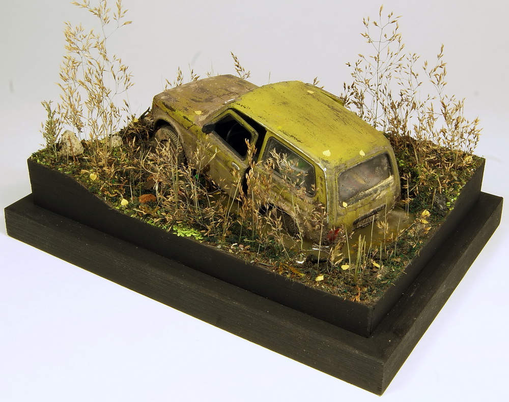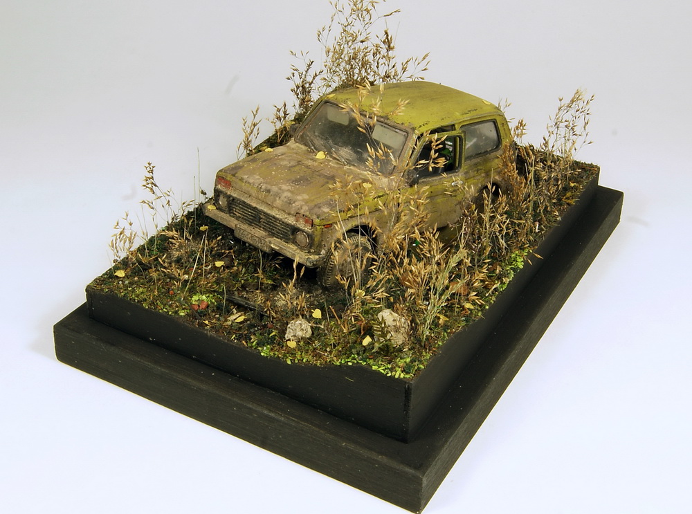В центре глубокой ... а-ля Die-Cast, наша родная Нива ВАЗ - 2121, в масштабе 1/36 купленная совершенно случайно в каком то детском магазине. Модель довольно топорная и полностью лишенная какой либо детализации. И представляемый мною сюжет ни что иное как очередная небольшая халтурка, сотворенная буквально за пару вечеров. Получилось очень грязно, но на это я и рассчитывал. И снова в желтом цвете ... бесит ... каюсь.