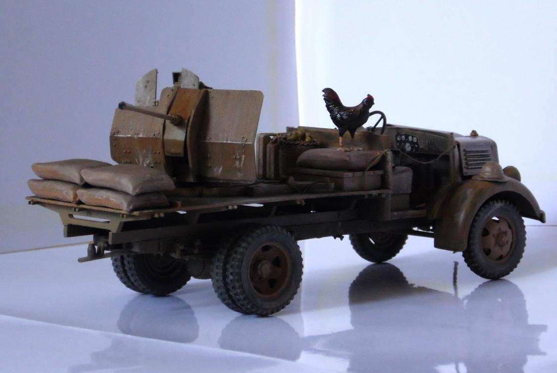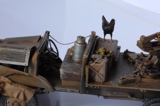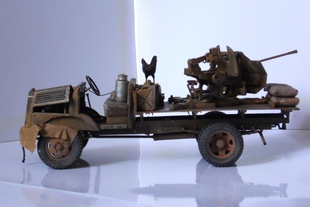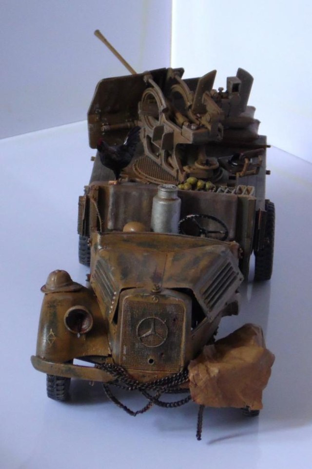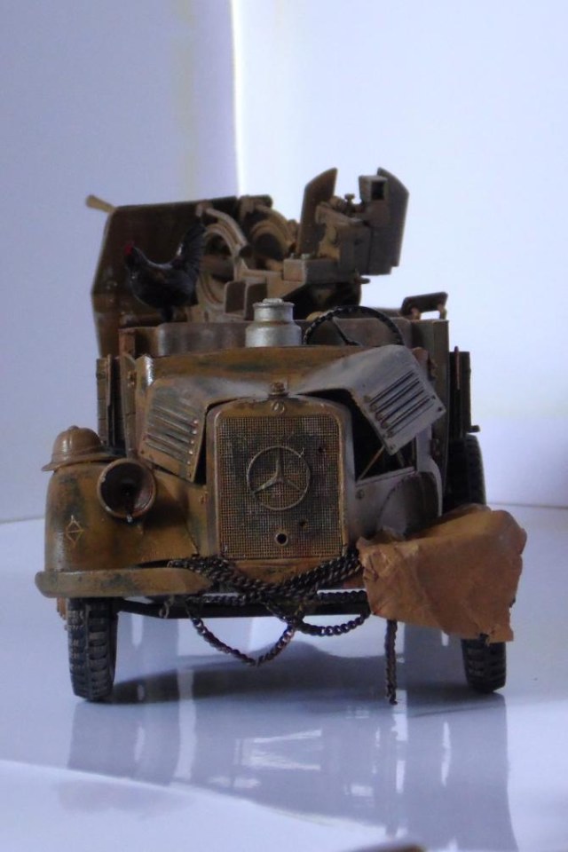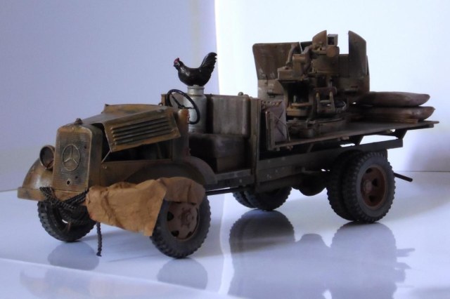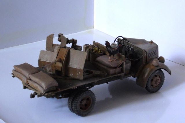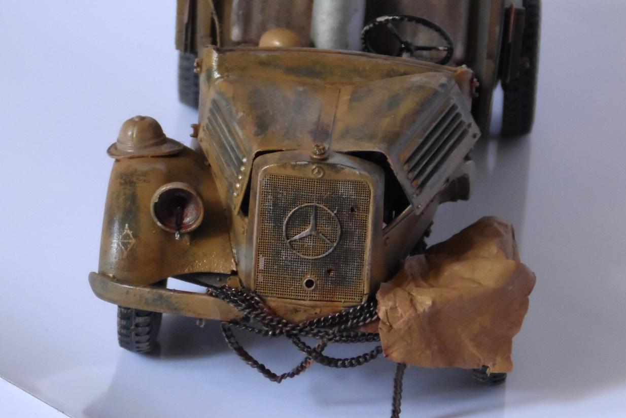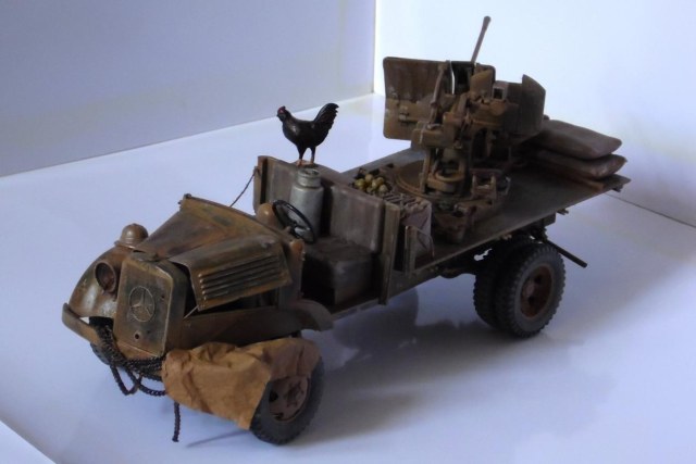 Однажды, зайдя к товарищу-земляку, узнал что он только что со злости выкинул свой Мерседес от Miniart. Вобщем, недолго рассуждая, он мне его отдал, вернее то что от него осталось (достав при этом уже из ведра :)). У меня он ввиде такого конструктора провалялся еще около года, но не так давно попался мне на глаза, ну и понеслась. Птица, мешки и зенитка от Tamiya, бидон и что-то в корзине, смола, неизвестно чьё.