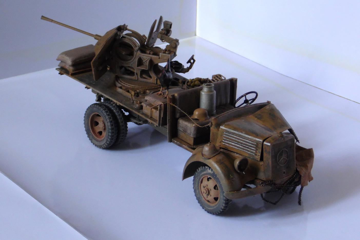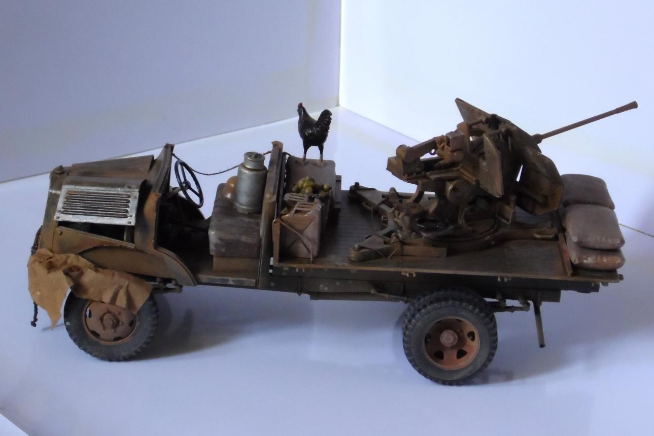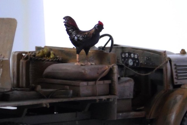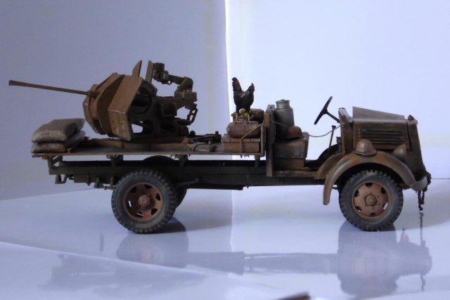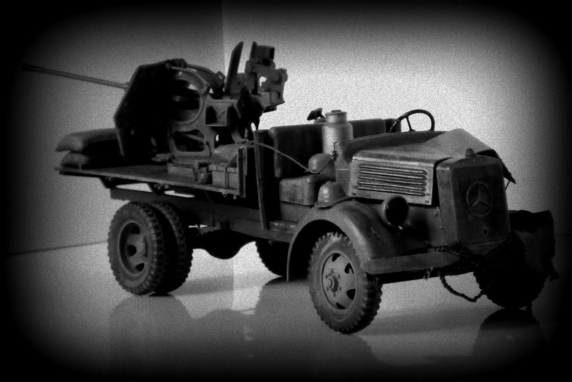 Однажды, зайдя к товарищу-земляку, узнал что он только что со злости выкинул свой Мерседес от Miniart. Вобщем, недолго рассуждая, он мне его отдал, вернее то что от него осталось (достав при этом уже из ведра :)). У меня он ввиде такого конструктора провалялся еще около года, но не так давно попался мне на глаза, ну и понеслась. Птица, мешки и зенитка от Tamiya, бидон и что-то в корзине, смола, неизвестно чьё.