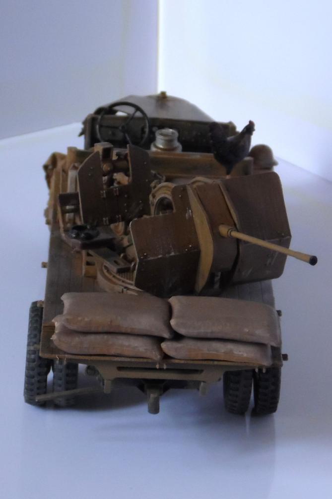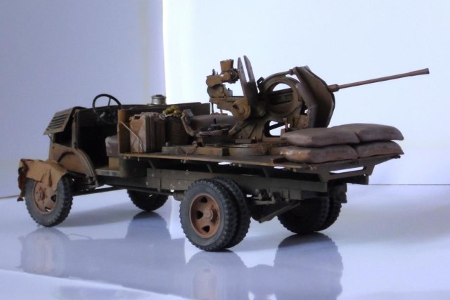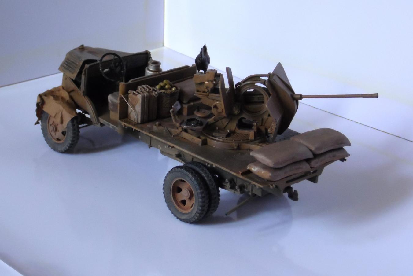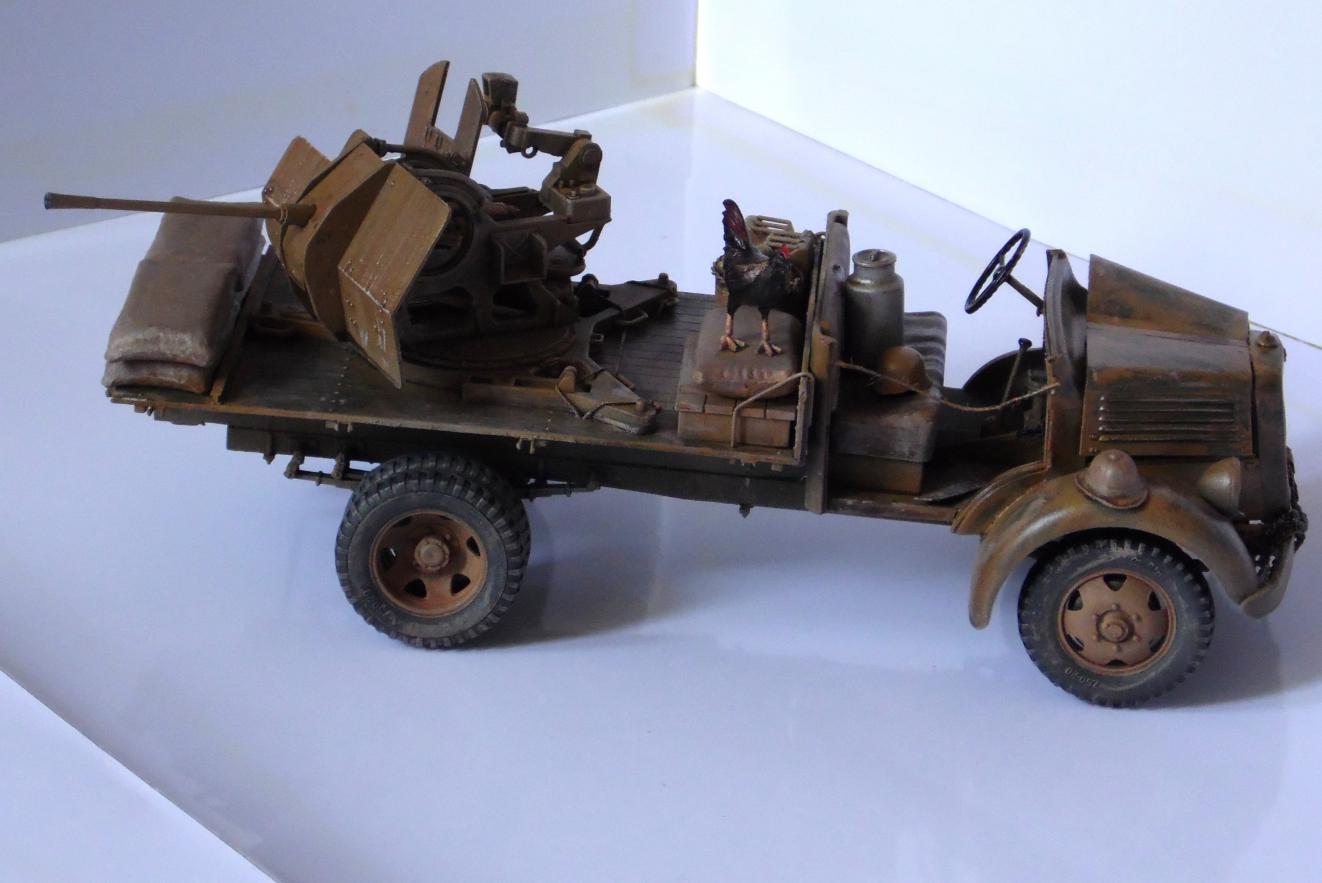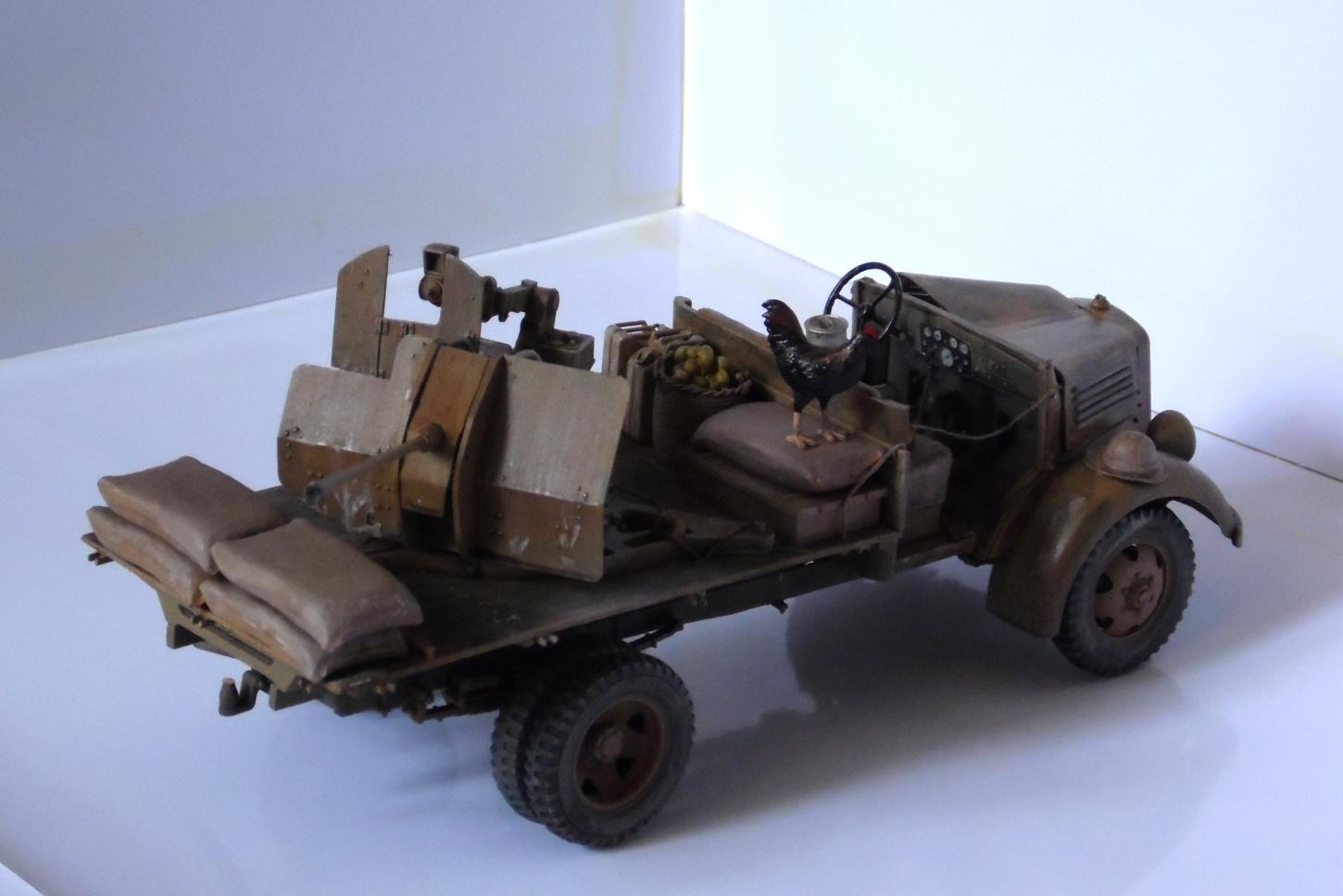 Однажды, зайдя к товарищу-земляку, узнал что он только что со злости выкинул свой Мерседес от Miniart. Вобщем, недолго рассуждая, он мне его отдал, вернее то что от него осталось (достав при этом уже из ведра :)). У меня он ввиде такого конструктора провалялся еще около года, но не так давно попался мне на глаза, ну и понеслась. Птица, мешки и зенитка от Tamiya, бидон и что-то в корзине, смола, неизвестно чьё.