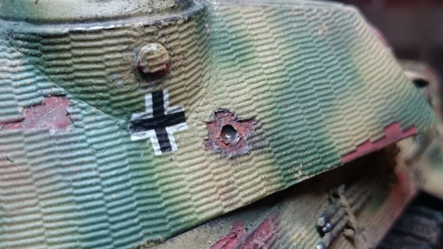 В общем ставим точку в этом вопросе."Ортрдоксы" подсказали, что светлые пятна(не серые) в месте скола циммерита - это как бы "печать" темно-желтого цвета, оставленная циммеритом. Если циммерит припекся хорошо, то при скалывании он оставляет "печать" на броне темно-желтого цвета. Если циммерит не достаточно хорошо припекался к броне, то скалывался - чисто до грунта( красного ), без "печати". Качество припекания могло зависеть от многих факторов - самого рабочего, температуры в цехе и т.д. Касаемо серого цвета на местах сколов циммерита это принятое "течение" забугорных моделистов, ничем не подтвержденное!
