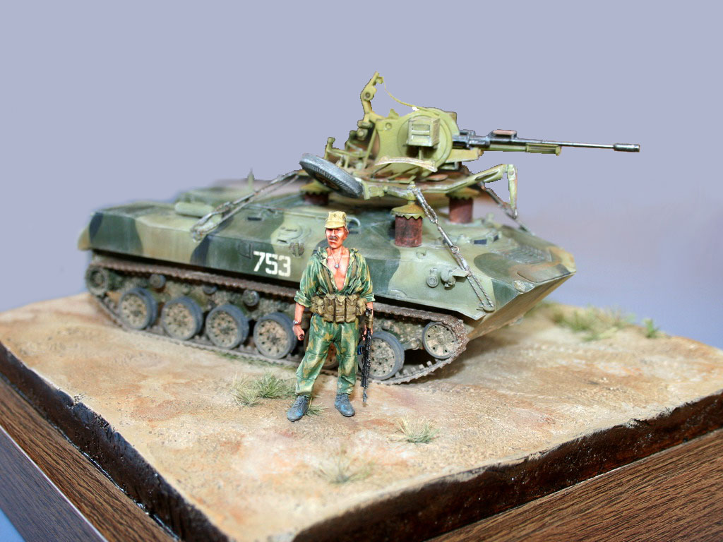 Такой вариант установки ЗСУ оказывает повышенную нагрузку на передние катки БМД. Предпочтительнее установка такого орудия на корму машины. Представленный автором вариант применялся в Тульской дивизии ВДВ. Пермяки пошли грамотнее. Диорама понравилась.